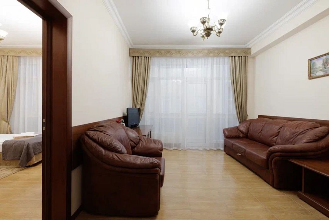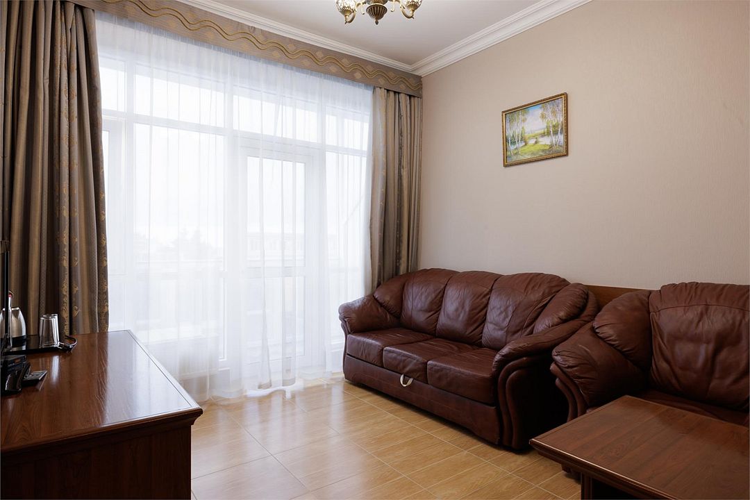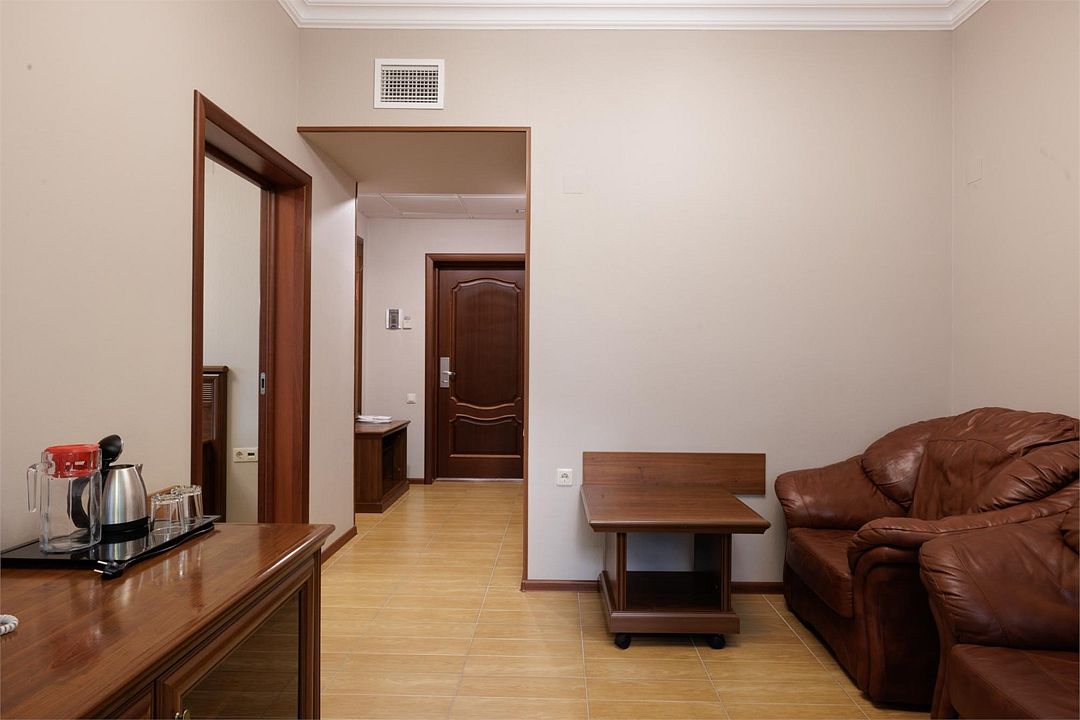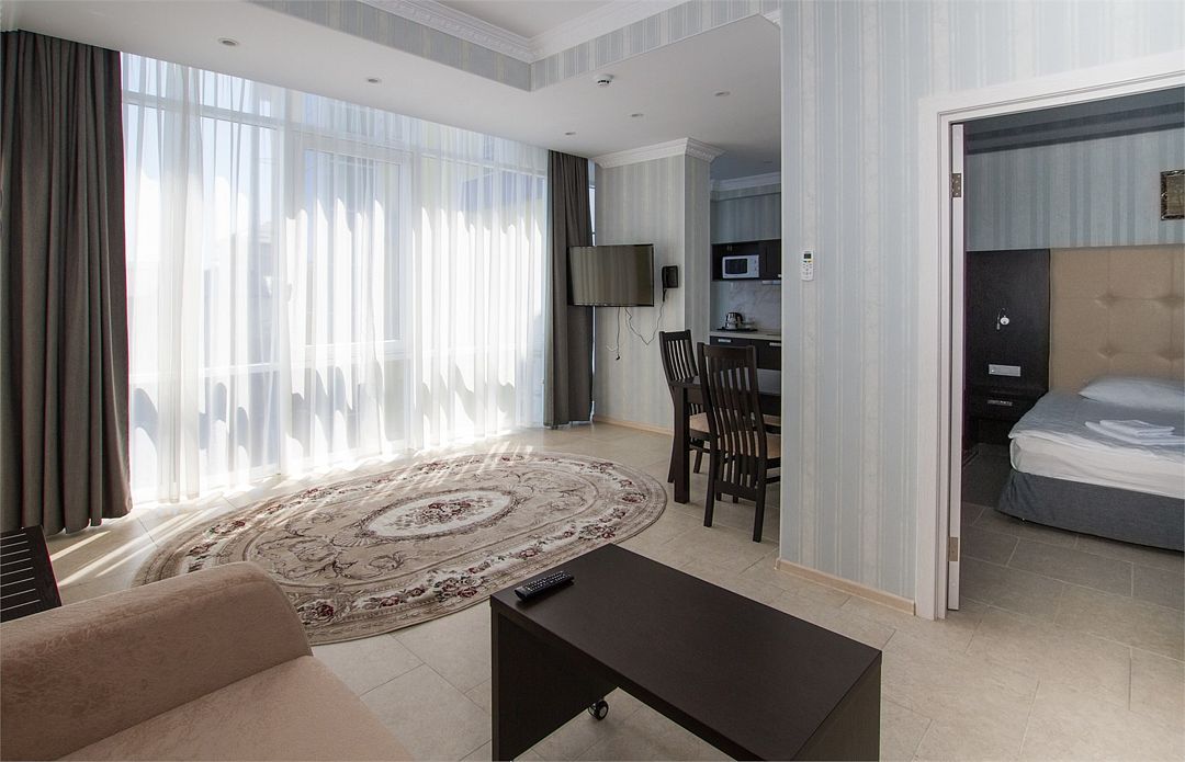 Двухкомнатный номер с балконом. Спальная комната: 2 односпальные кровати с прикроватными тумбочками туалетный столик, телевизор. Гостиная: набор мягкой кожаной мебели, шкаф, журнальный столик, тумба под телевизор и холодильник. Ванная комната : душ, санузел, фен, халаты, тапочки. Максимальная вместимость - до 4 человек.Услуги и удобства