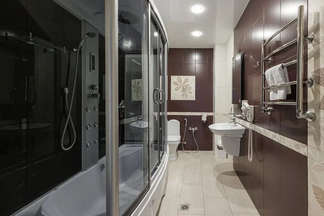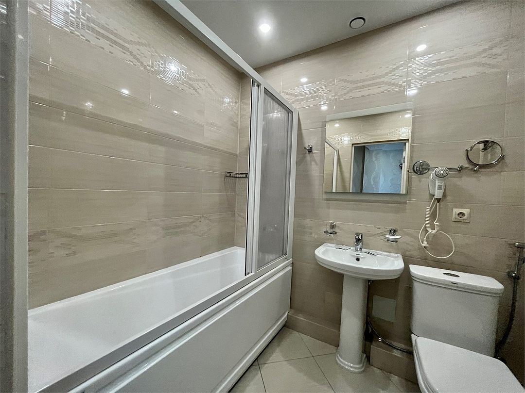два телевизора, Wi-Fi, настольные лампы, фен, электронные замки, душевая кабина, санузел, халаты, банные полотенца, тапочки, балкон, двуспальная кровать, стулья, шкаф для одежды, вешалки, журнальный столик, зеркало, две комнаты, чайный набор, сейф, чайник, унитаз, раковина, отопление, вид на город, кулер на этаже, плиточное покрытие, кресло, стаканы, столовые приборы, туалетный столик, сплит-система, раскладной диван, внутренний телефон, мини-холодильник, гостиничная парфюмерия, вид на бассейн, рабочий стол, без питомцевВ гостиничном номере