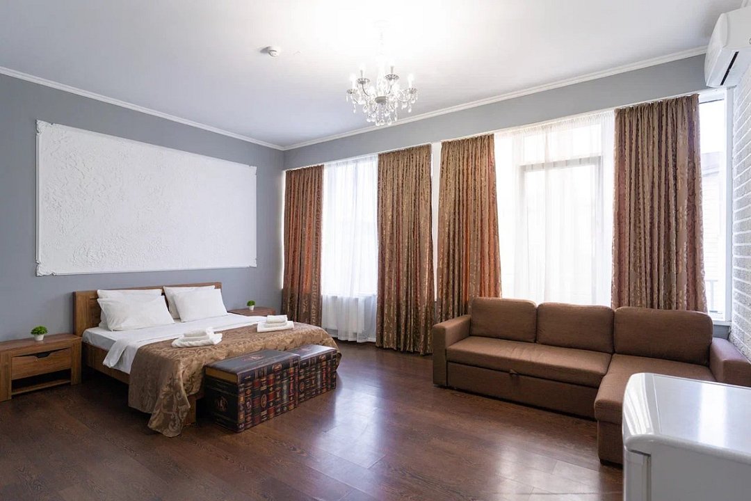 Номер четырехместный люкс на 4 этаже, просторный большой номер, удобства в номере. Двуспальная кровать и диван-кроватьУслуги и удобства