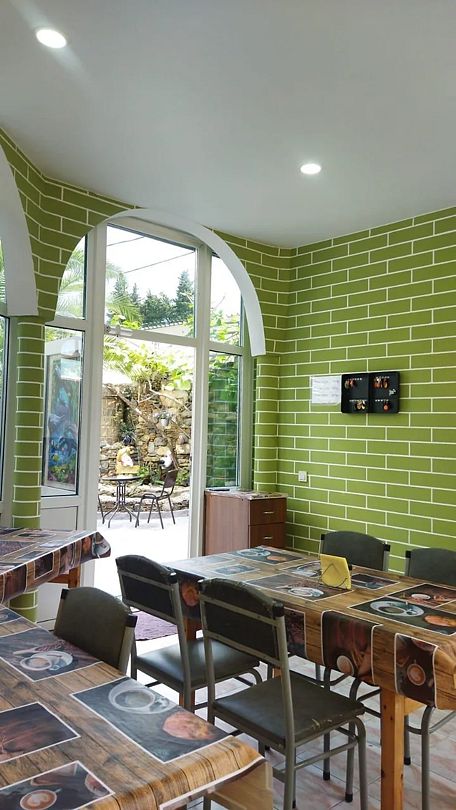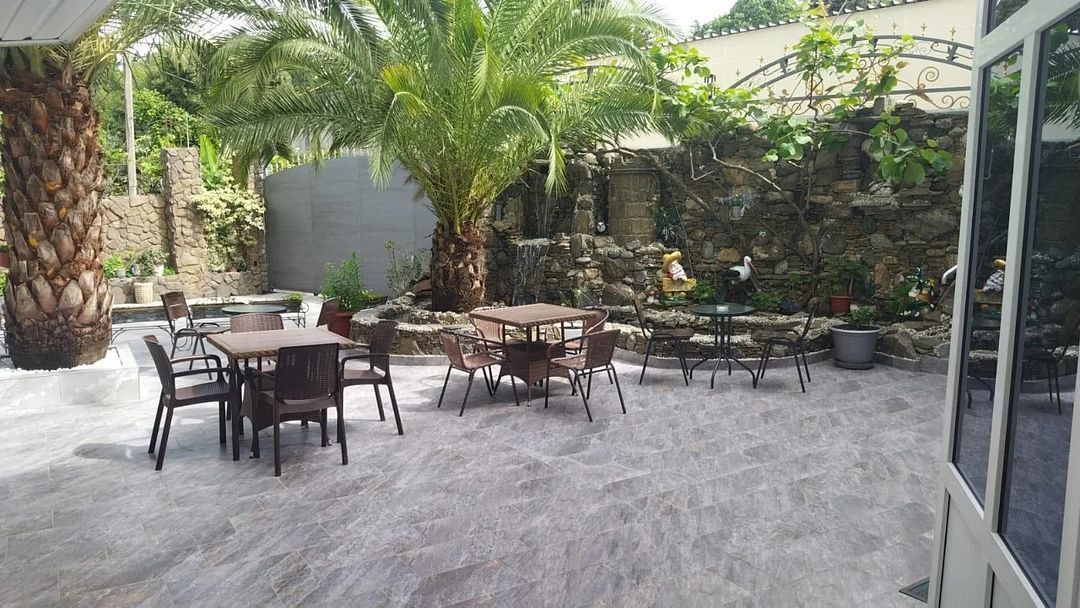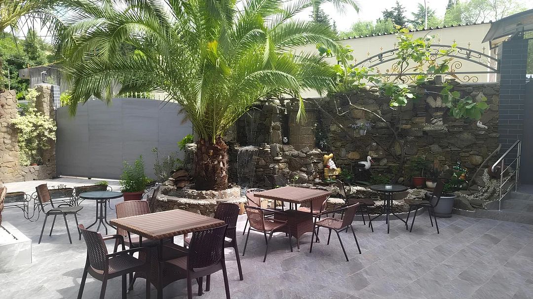На территории гостевого дома ежедневно работает пиццерия, действует кафе-столовая, где гости смогут, не выходя за территорию гостевого дома, заказать вкусные завтраки, обеды и ужины. Есть уютная зона отдыха рядом с искусственным водопадом под настоящими пальмами. В числе прочих услуг – круглосуточный репесепшн, беспроводной интернет и автопарковка.