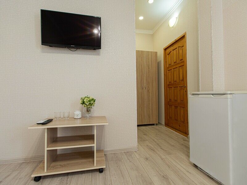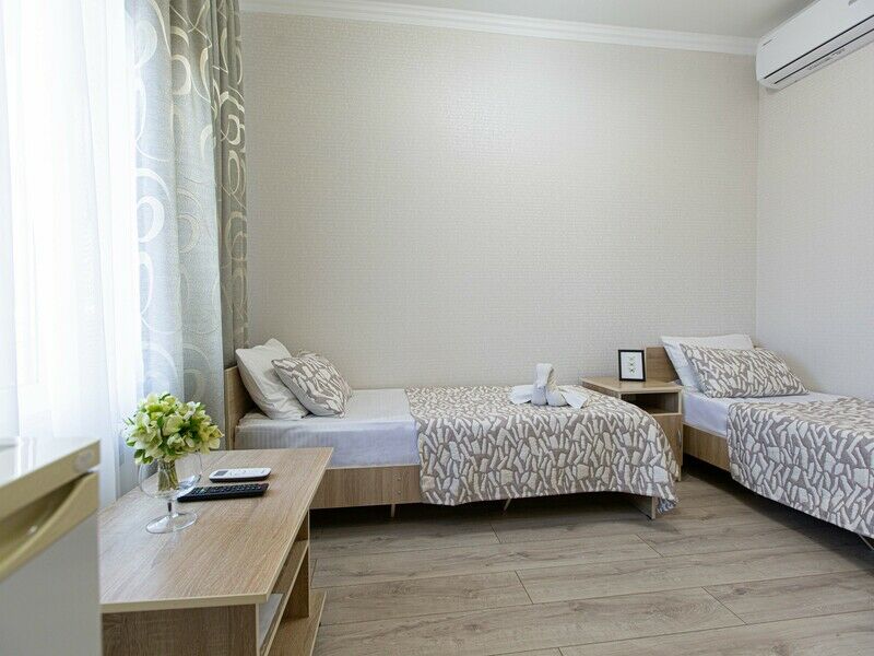 2 односпальные или одна двуспальная кровати, тв, кондиционер, холодильник, журнальный столик, прикроватная тумбочка, душ, туалет