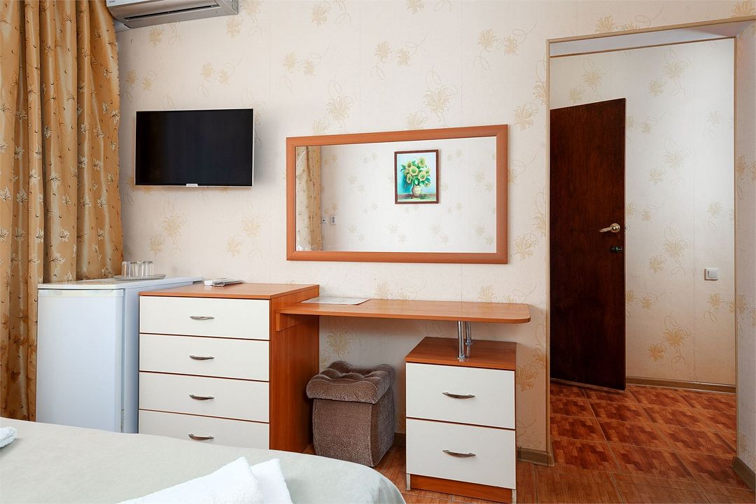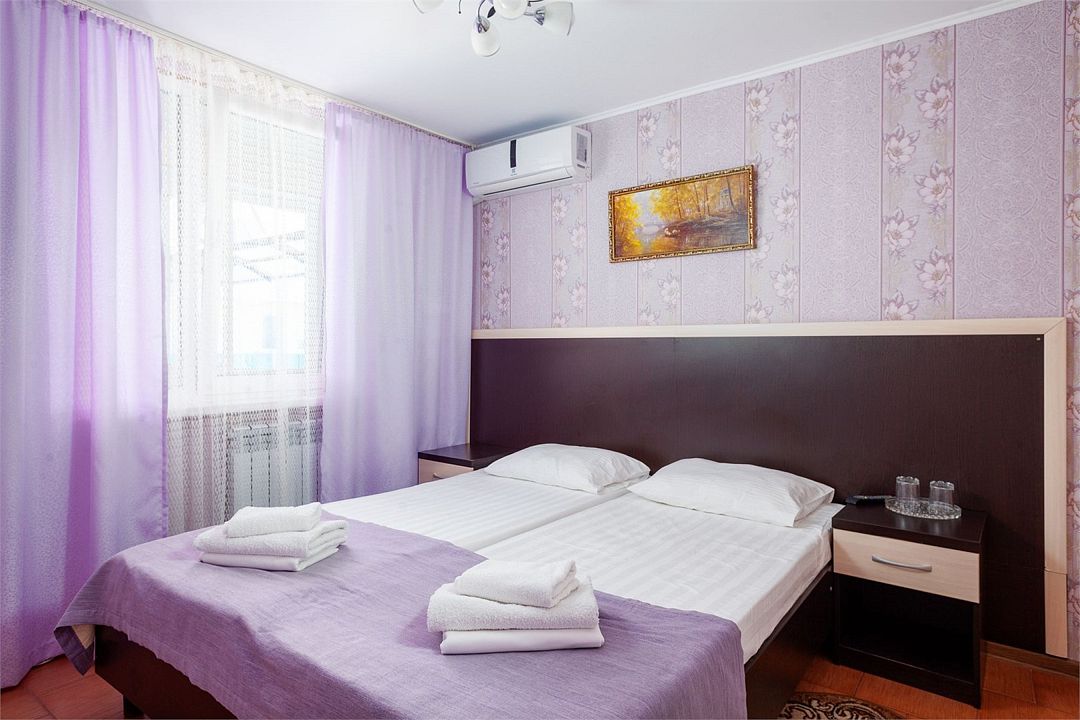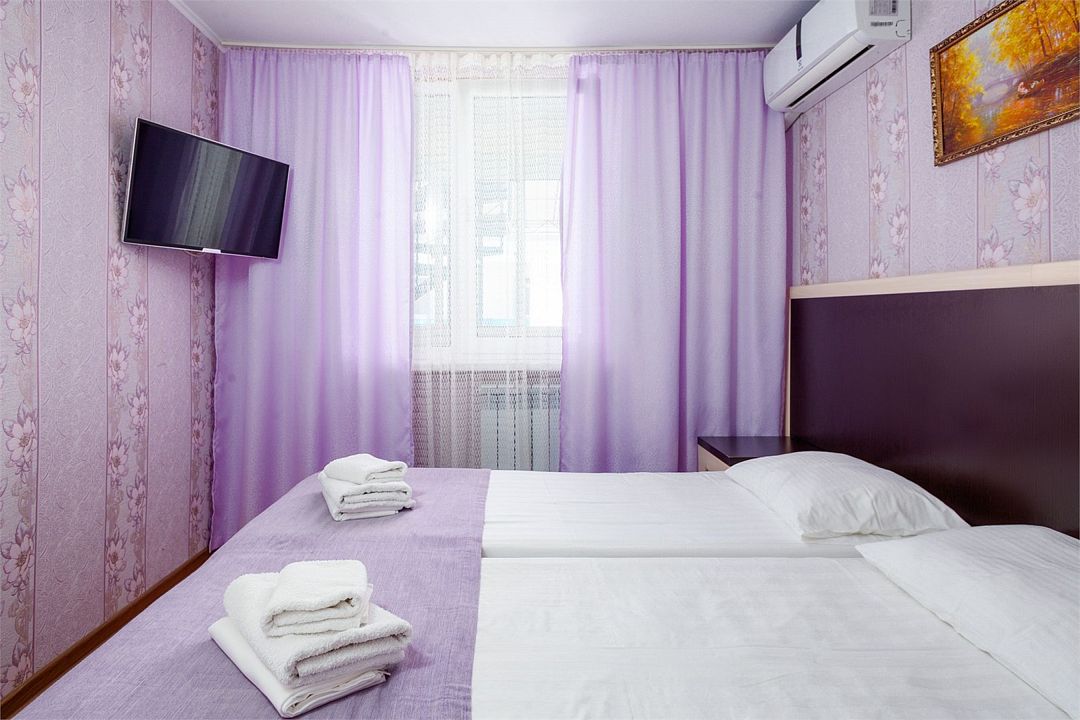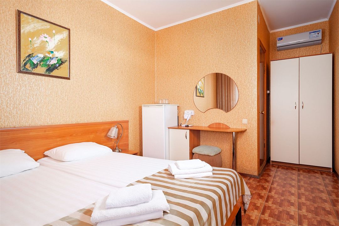 Wi-Fi, кондиционер, фен, две полутораспальные кровати, вешалки, зеркало, сейф, унитаз, раковина, стаканы, стул, туалет, телевизор с плоским экраном, мини-холодильник, без питомцевВ гостиничном номере