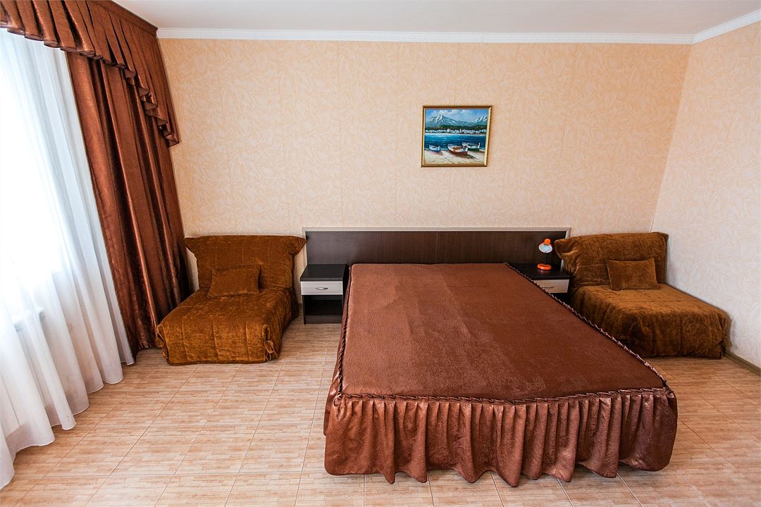 Комфортный семейный номер , оборудованный всем неоходимым для отдыха. Общий балкон.Услуги и удобства