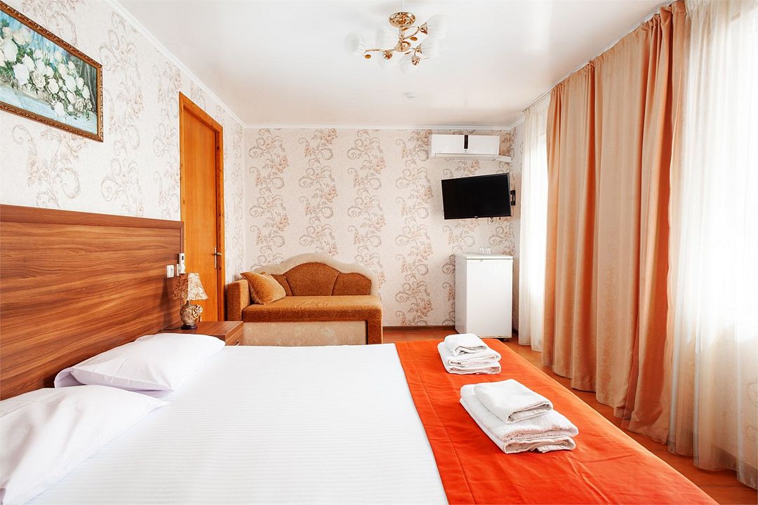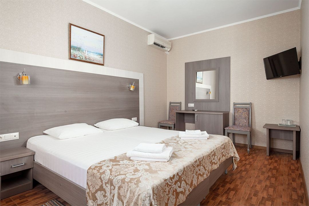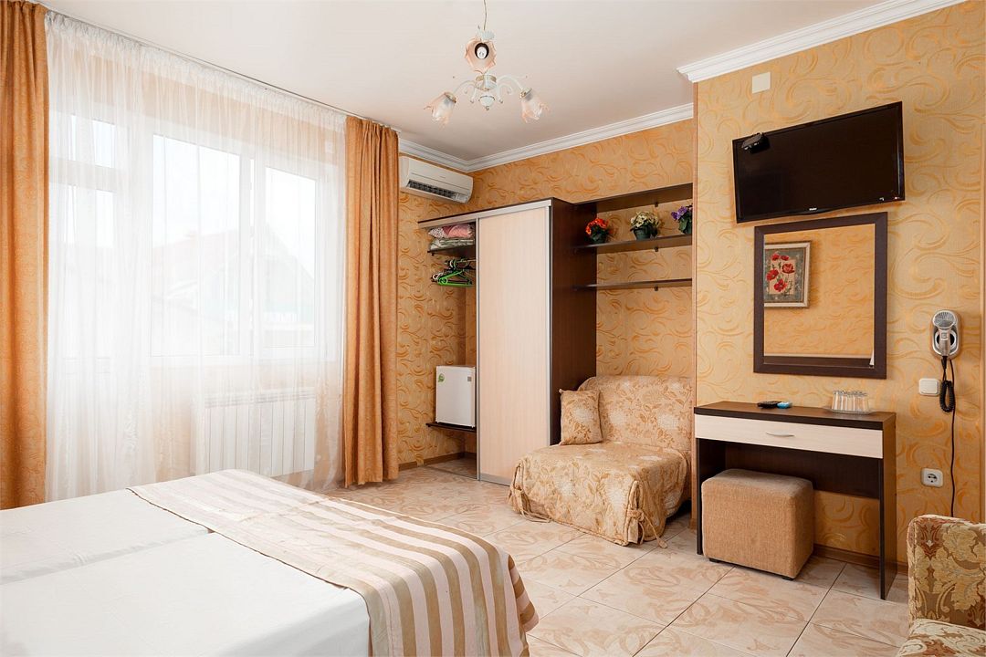 Wi-Fi, кондиционер, настольные лампы, фен, банные полотенца, двуспальная кровать, шкаф для одежды, зеркало, сейф, чайник, стаканы, стул, туалет, цифровое тв, диван-кровать, раскладное кресло, телевизор с плоским экраном, мини-холодильник, без питомцевВ гостиничном номере