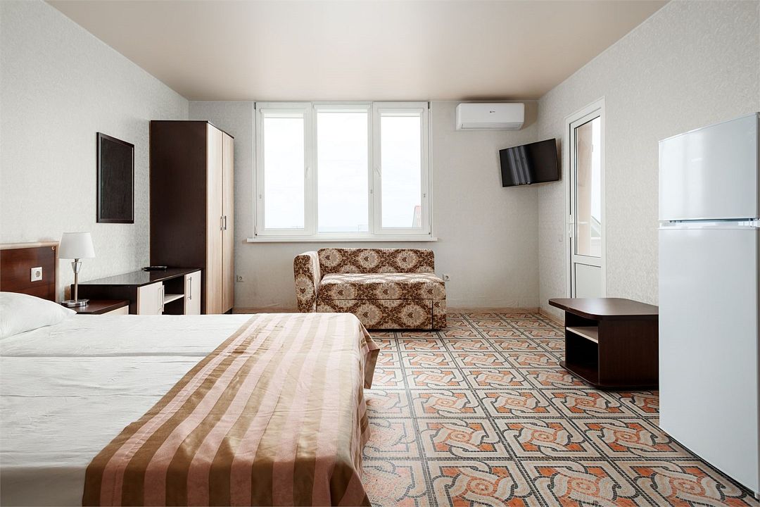 Wi-Fi, кондиционер, светильник, фен, банные полотенца, балкон, две полутораспальные кровати, вешалки, журнальный столик, сейф, унитаз, раковина, душ, стул, туалет, диван-кровать, раскладное кресло, телевизор с плоским экраном, мини-холодильник, без питомцевВ гостиничном номере