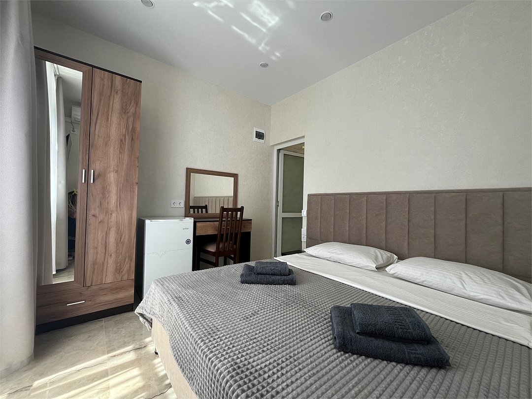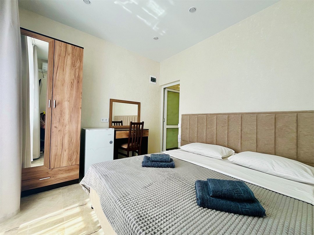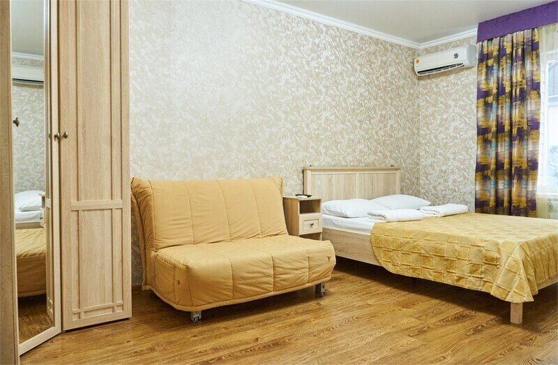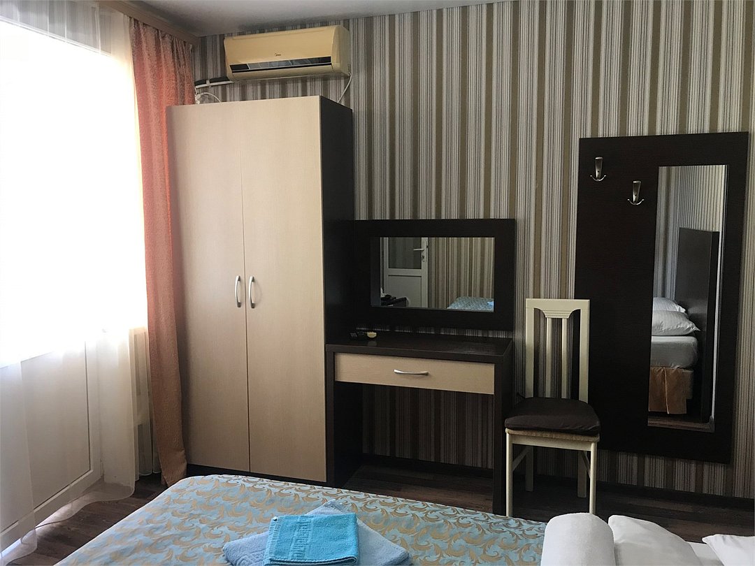 Wi-Fi, светильник, фен, банные полотенца, две односпальные или большая двуспальная кровать, тумбы, шкаф для одежды, зеркало, чайник, унитаз, раковина, отопление, душ, вид во двор, ламинат, стаканы, стул, туалетный столик, туалетные средства, туалет, сплит-система, цифровое тв, телевизор с плоским экраном, мини-холодильник, можно с питомцамиВ номере