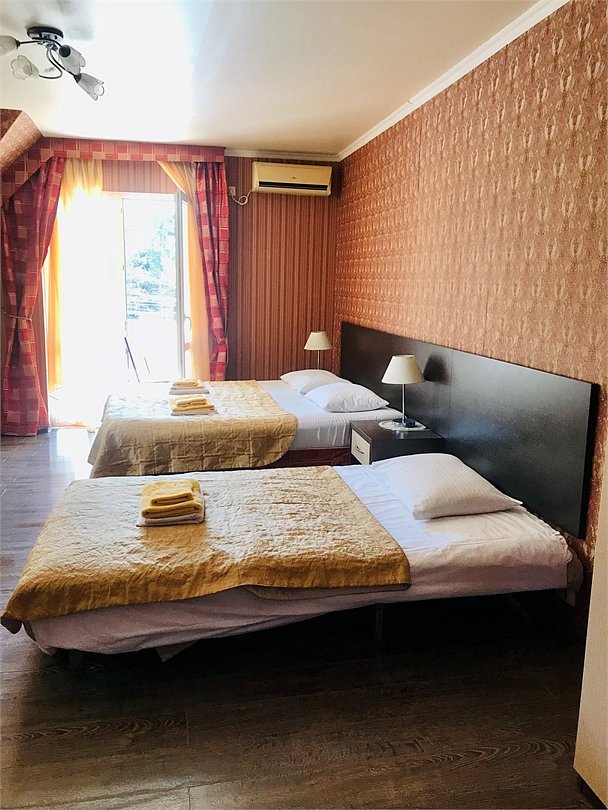 Три 1-спальные кровати или одна 2-спальная и одна 1-спальная кровати, с/у с душем, ТВ, кондиционер, мини-холодильник, чайник, фен