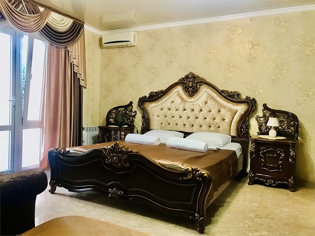 Кровать 2-спальная King size, 1- спальная кровать, софа, с/у с джакузи, ТВ, кондиционер, мини-холодильник, микроволновая печь, чайник, фен