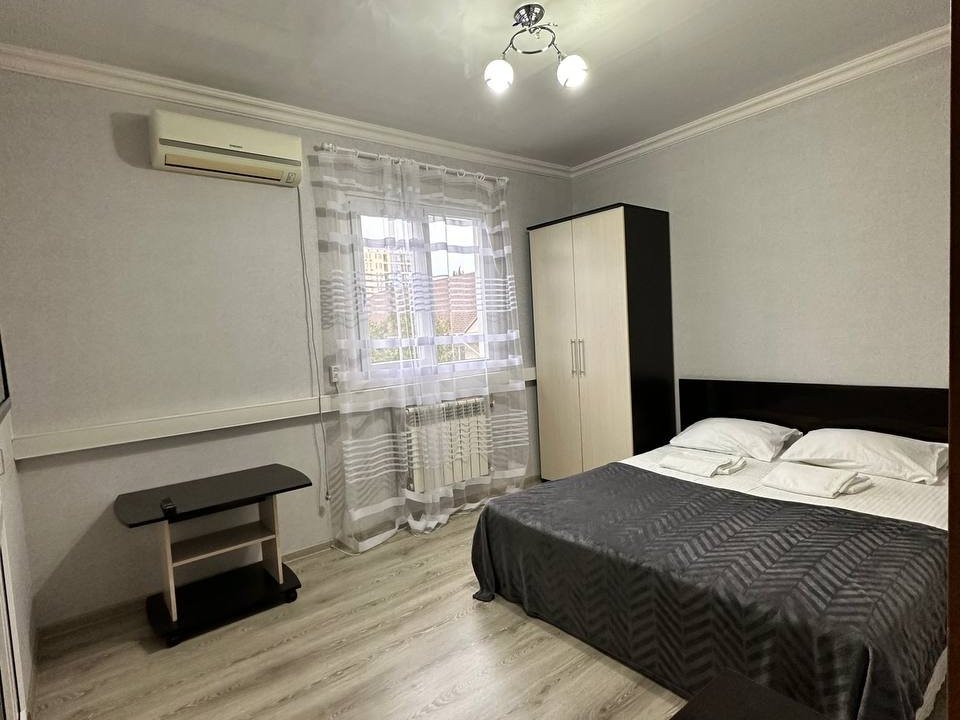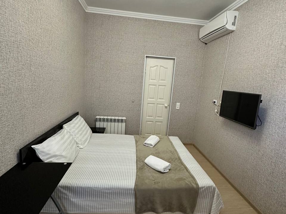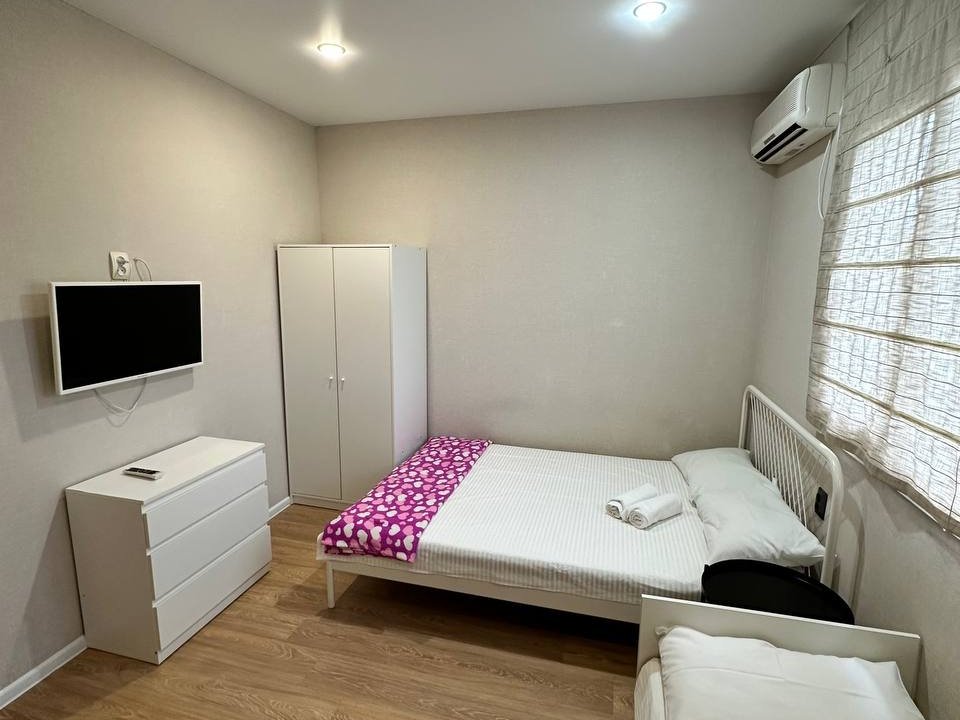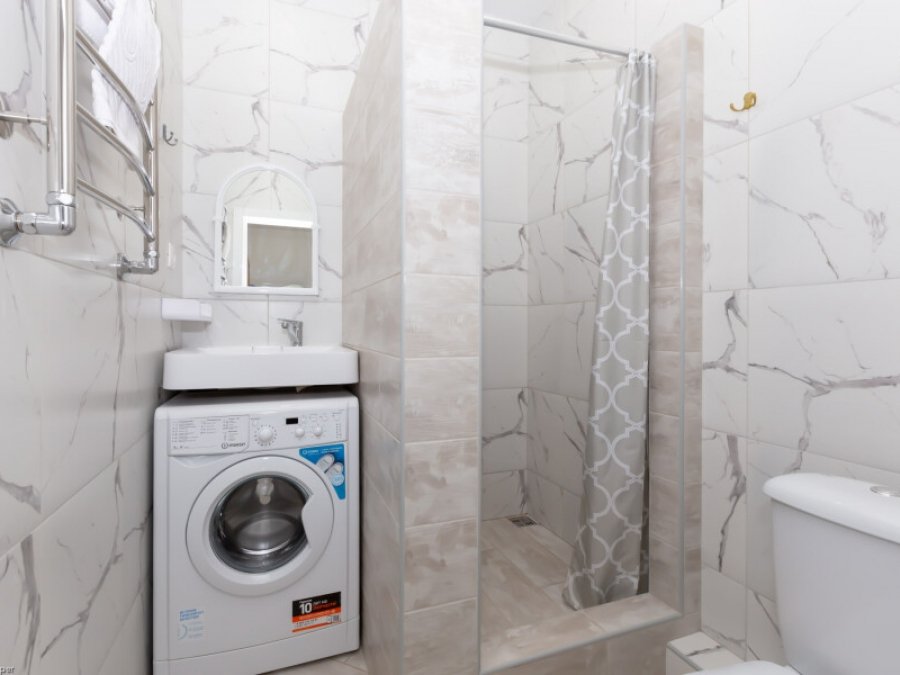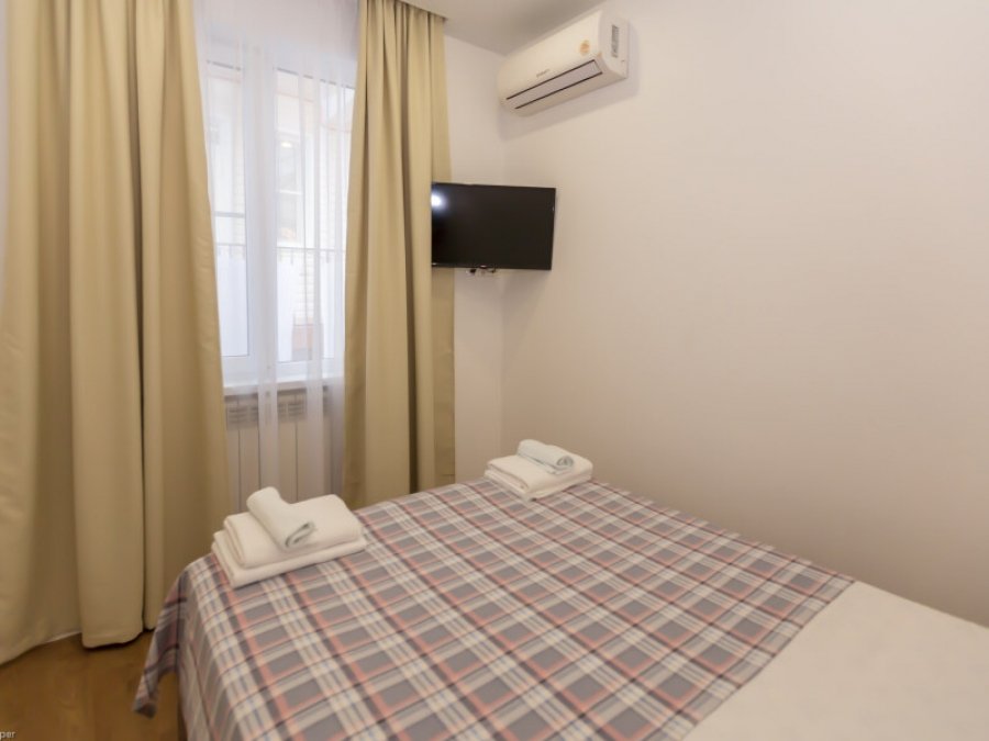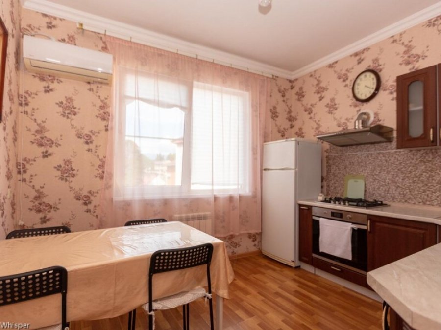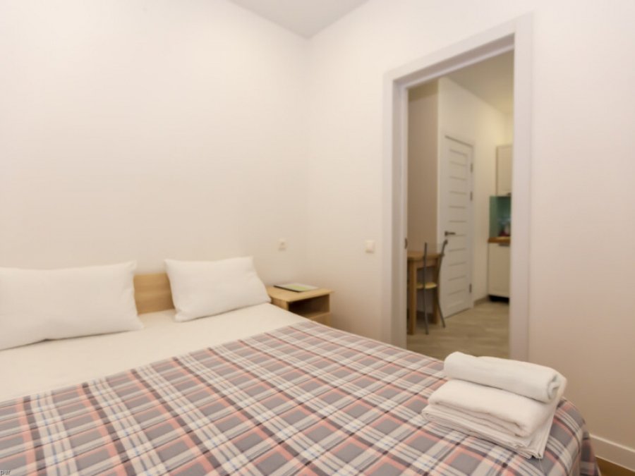 Однокомнатная квартира с полноценной зоной для самостоятельного приготовления пищи подойдет для гостей, которые привыкли к собственной домашней еде. На кухне есть все необходимое: холодильник, плита, чайник, посуда для приема и для приготовления пищи, вытяжка и кондиционер. Из мебели на кузне так же имеется обеденная зона со стульями и при необходимости можно разложить спальное место. В квартире так же имеется полноценная изолированная комната для отдыха с двуспальной кроватью, телевизором и кондиционером. В квартире так же имеется санузел с современным свежим ремонтом и стиральная машина.В номере