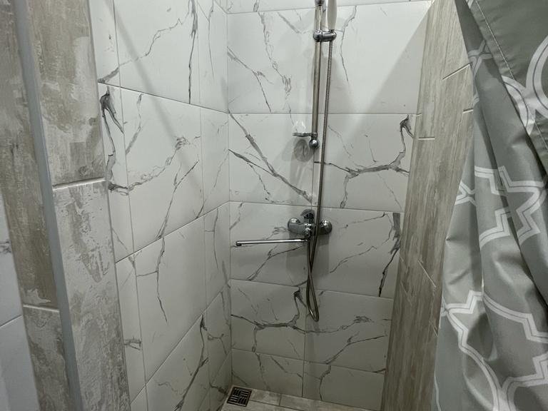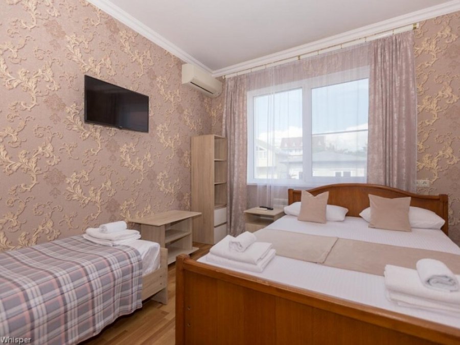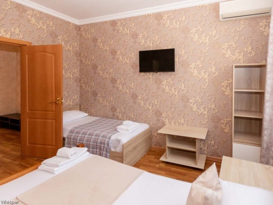 В номере стулья, тумбочки, шкаф, кровать двуспальная и кровать односпальная, журнальный столик, стол, вешалка, посуда. Санузел, душ в номере.В номере