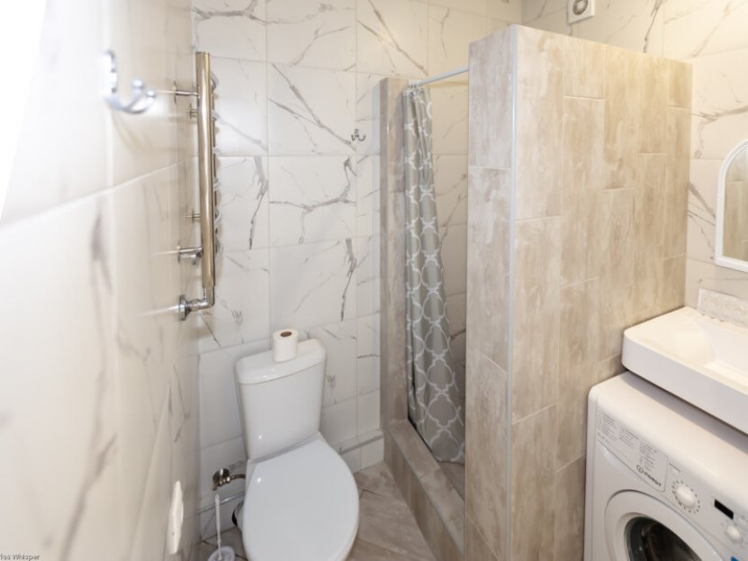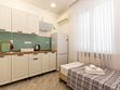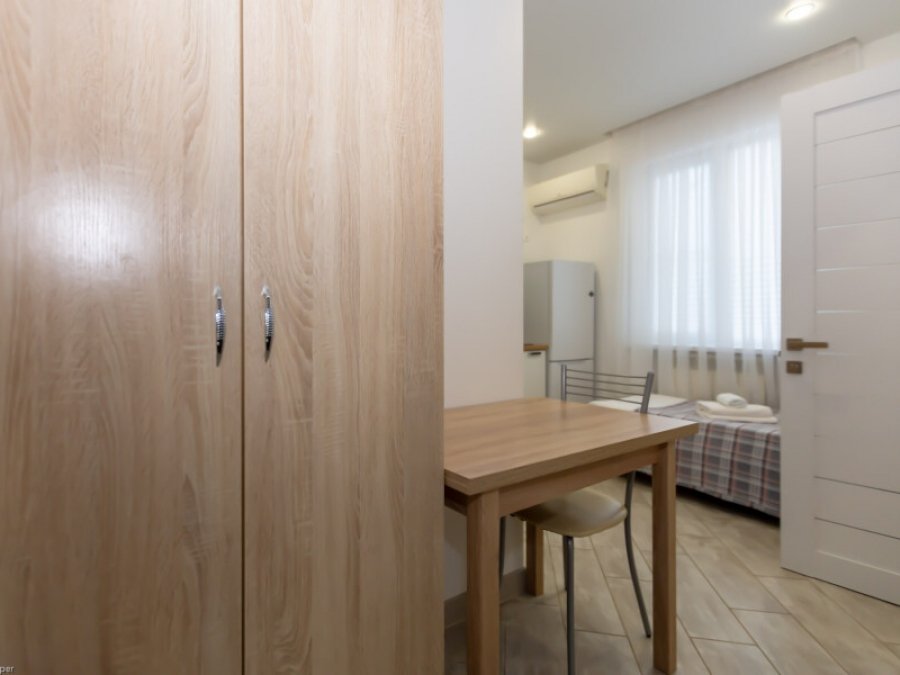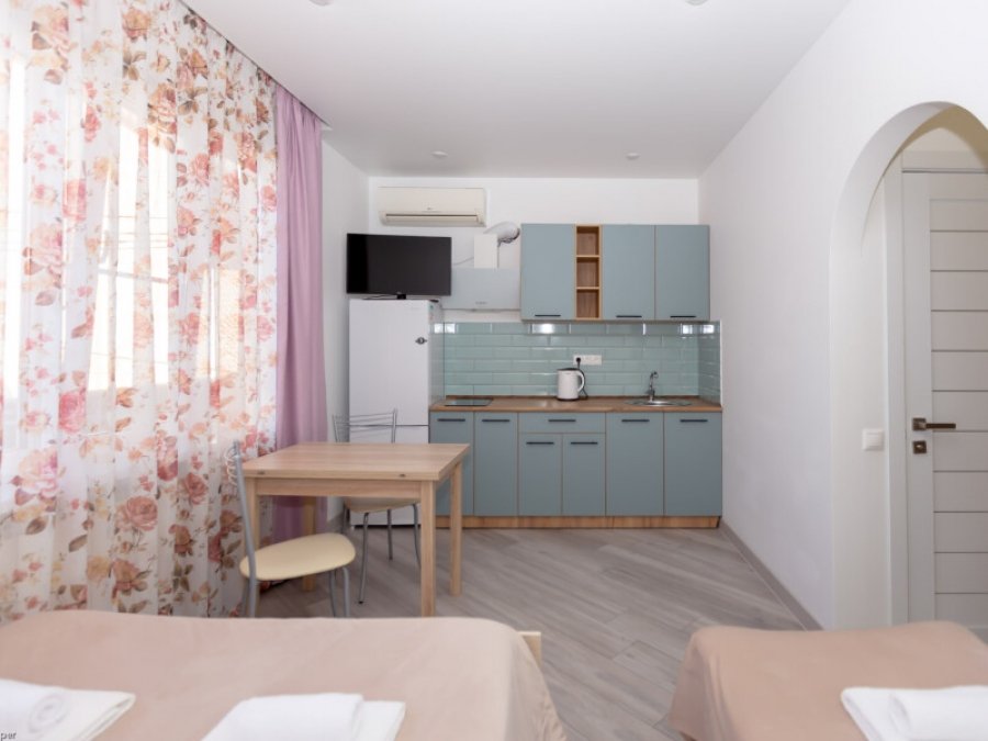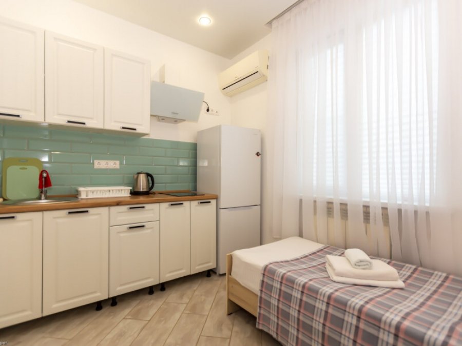 Квартира-студия с полноценной зоной для самостоятельного приготовления пищи подойдет для гостей, которые привыкли к собственной домашней еде. На кухне есть все необходимое: холодильник, плита, чайник, посуда для приема и для приготовления пищи, вытяжка и кондиционер. Из мебели на кухне так же имеется обеденная зона со стульями Спальные места включают в себя 2х спальную и односпальную кровати. В квартире так же имеется санузел с современным свежим ремонтом и стиральная машина.В номере