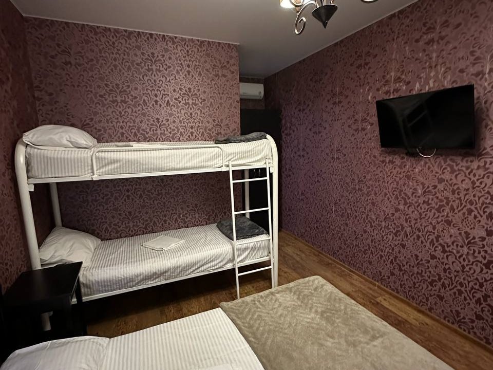 В номере стулья, тумбочки, шкаф, кровать двуспальная и односпальные (двухярусные), журнальный столик, стол, вешалка, посуда. Санузел, душ в номере.В номере