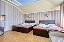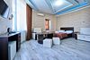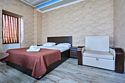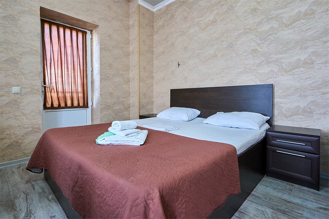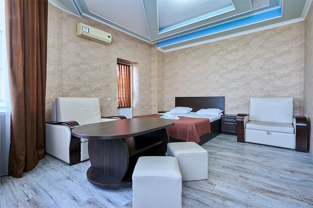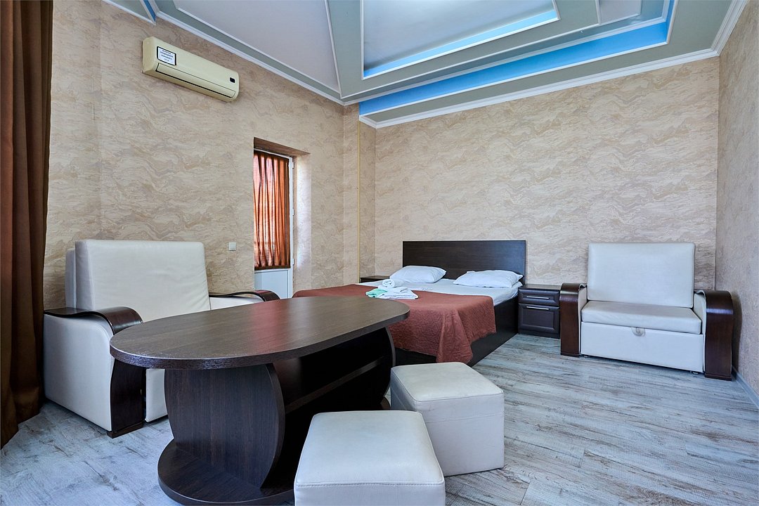Семейный номер до 7 человек, стулья, тумбочки, шкаф, кровать двуспальная, диван-кровать, журнальный столик, обеденный стол, стол, вешалка, посуда Техника: Wi-Fi интернет, кондиционер, телевизор, фен, холодильник, цифровое ТВ, электрочайникУслуги и удобства