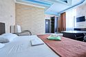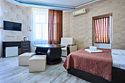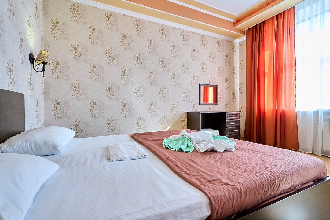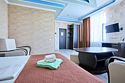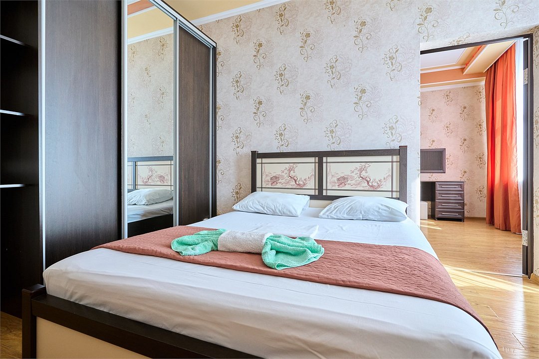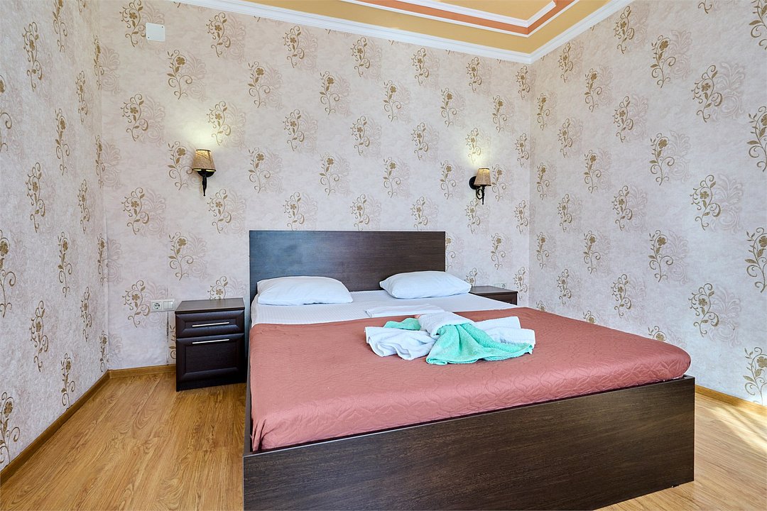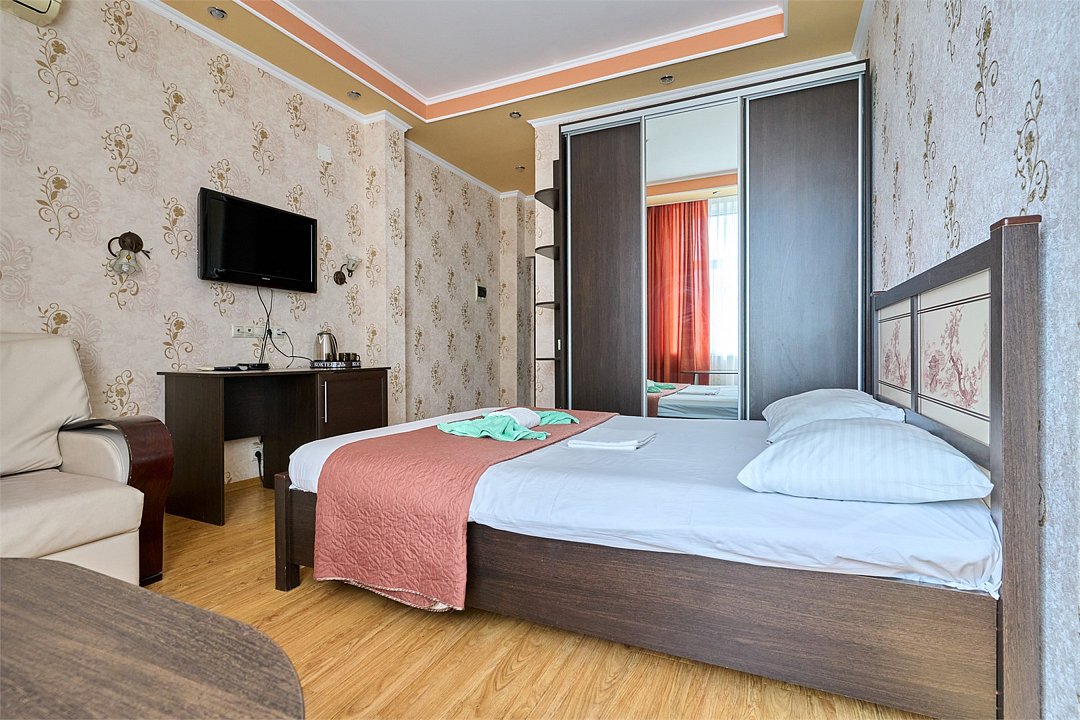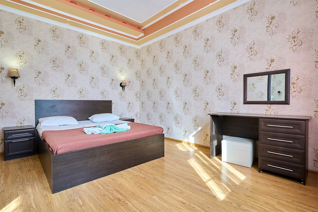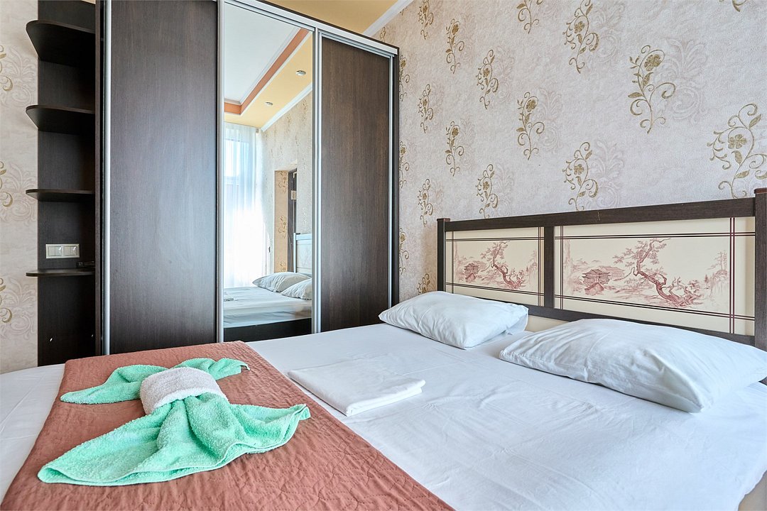Двухкомнатный номе на 4-6 человек, в номере стулья, тумбочки, шкаф, кровать двуспальная, диван-кровать, журнальный столик, кухонный стол, обеденный стол, стол, вешалка, посуда Техника: Wi-Fi интернет, кондиционер, телевизор, фен, холодильник, цифровое ТВ, электрочайник Душ, санузел: санузел и душ в номереУслуги и удобства