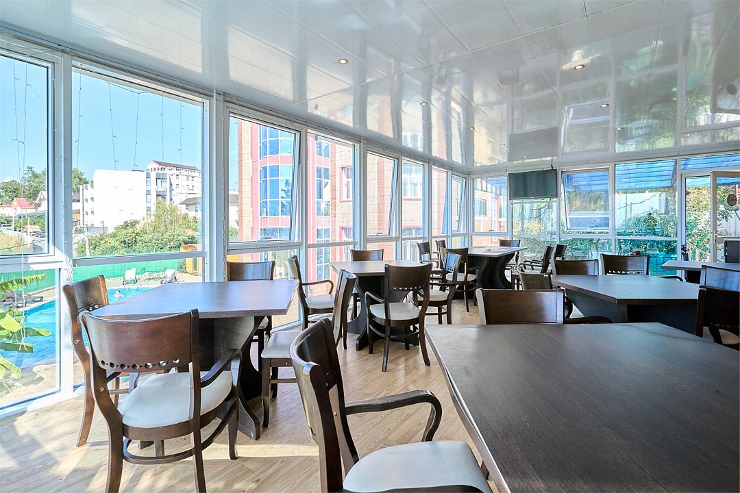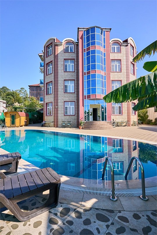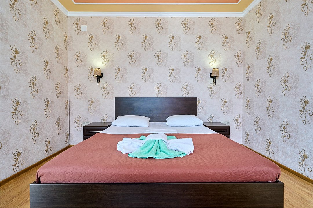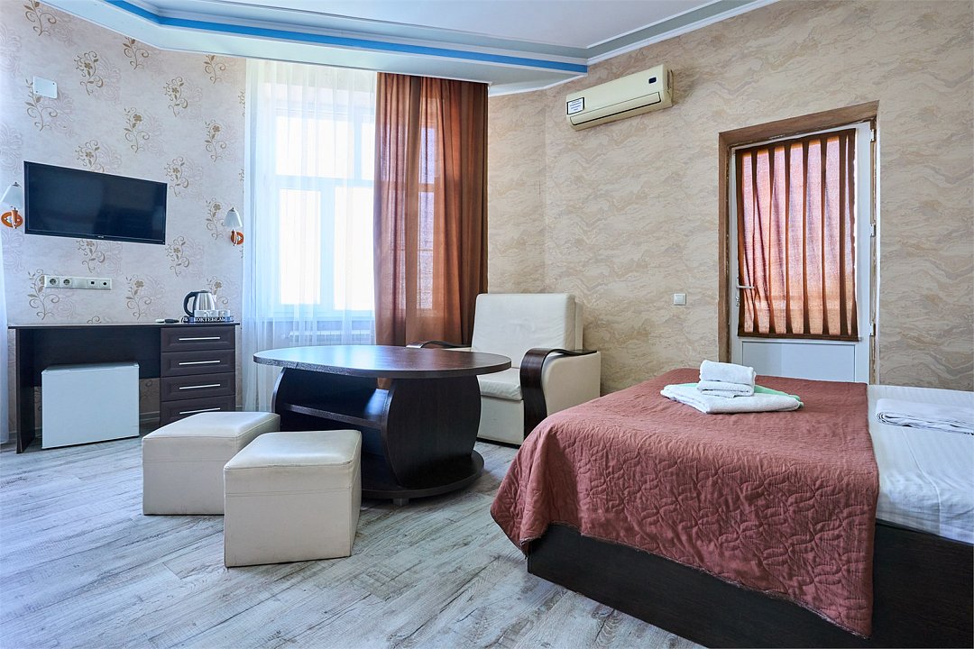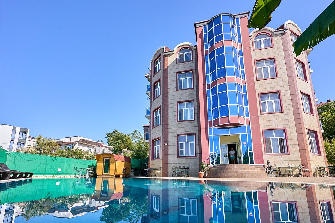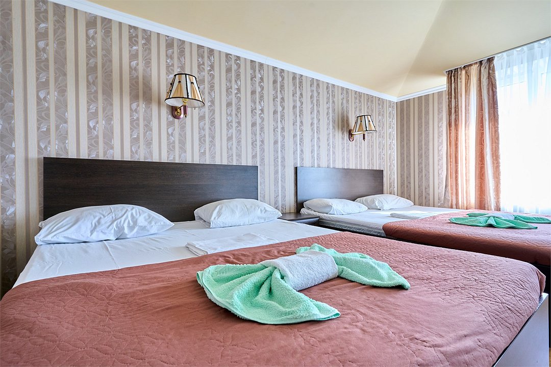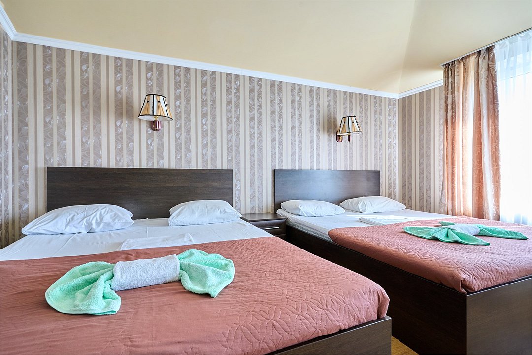 Четырехэтажный корпус располагается на благоустроенной закрытой территории. Гостей ожидают просторные комфортабельные номера трех категории. В номерах подключена сплит-система и есть все необходимое для хорошего отдыха: собственная ванная комната, плазменный телевизор, фен, мини-холодильник. Из номеров, расположенных на верхних этажах, открывается вид на море.