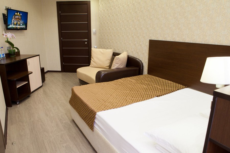 Одна двуспальная кровать, одно раскладное креслоВ гостиничном номере