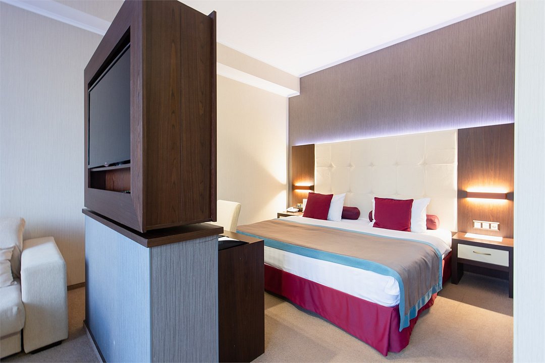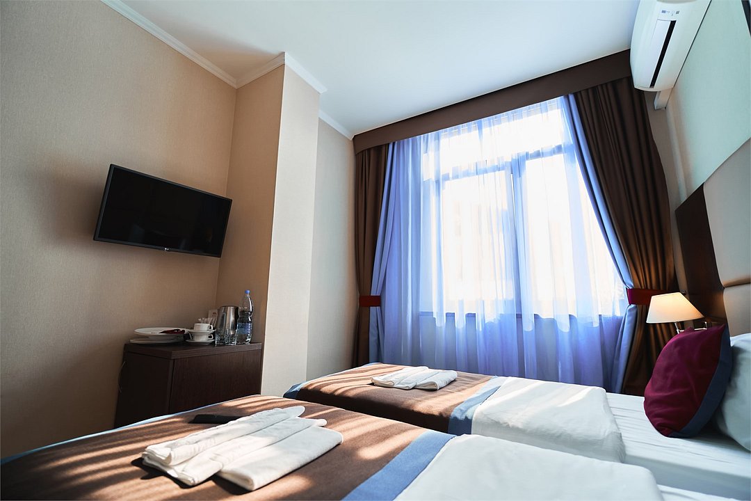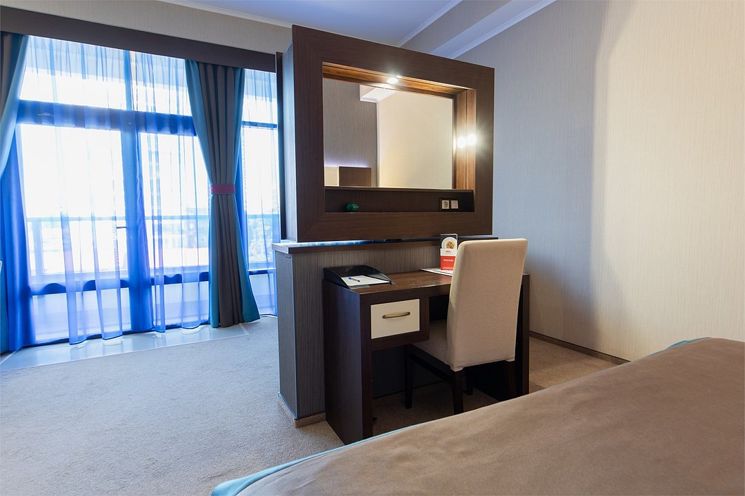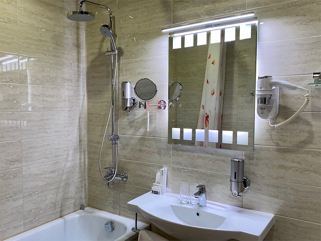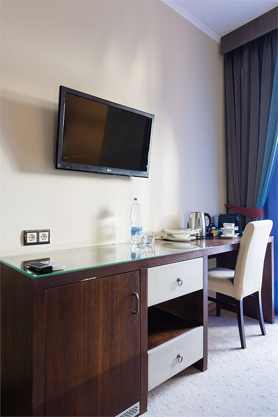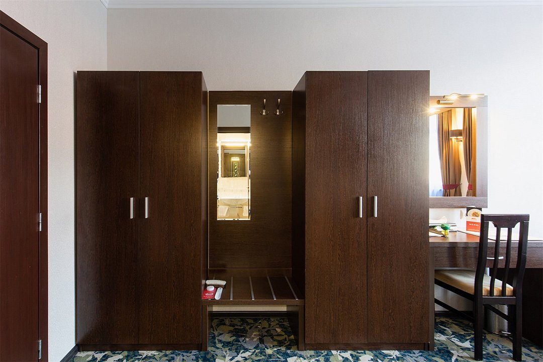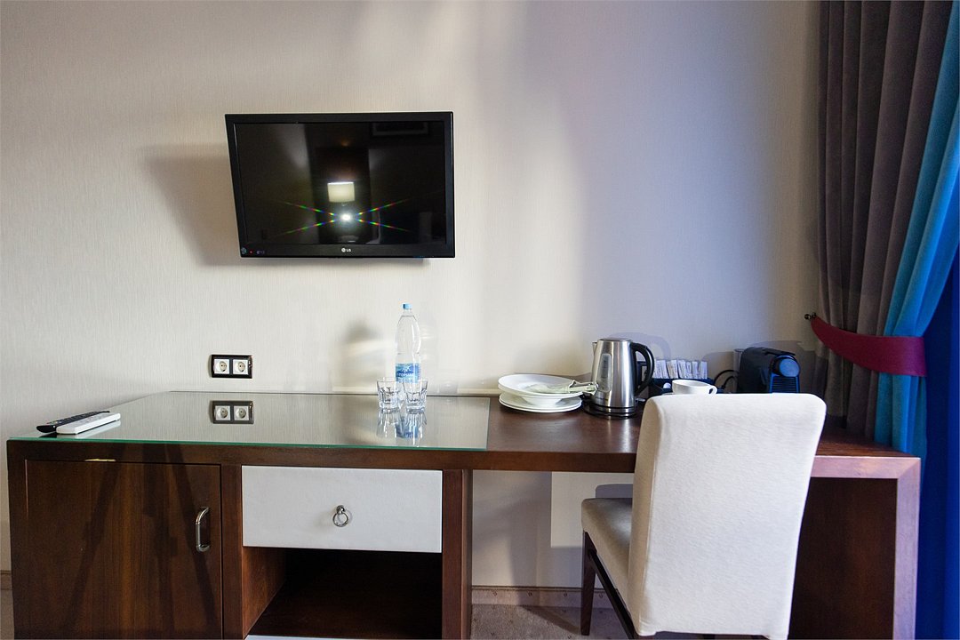 телевизор, спутниковое телевидение, интерактивное телевидение, Wi-Fi, телефон, светильник, фен, весы, будильник, электронные замки, кофемашина, утюг, душевая кабина, санузел, халаты, банные полотенца, пляжные полотенца, тапочки, гигиенические средства, косметические средства, балкон, балкон с красивым видом, две односпальные или большая двуспальная кровать, гипоаллергенное белье, гладильная доска, ортопедический матрас, тумбы, стулья, шкаф для одежды, вешалки, письменный стол, багажная тумба, зеркало, звуконепроницаемые стены и окна, письменные принадлежности, чайный набор, набор посуды, обслуживание номеров, информационная карта, меню, сейф, чайник, унитаз, раковина, косметическое зеркало, ковровое покрытие, душ, вид на город, вид во двор, стаканы, стол, туалет, сплит-система, мини-холодильник, номер для некурящих, онлайн-регистрация до заезда, гигиенический душ, фумигатор, уборка номера, набор для приготовления чая и кофе, вешалки-плечики, бутилированная вода, мыло, затемняющая штора, прачечная (за дополнительную плату), еда на вынос (за дополнительную плату), можно с питомцамиВ гостиничном номере