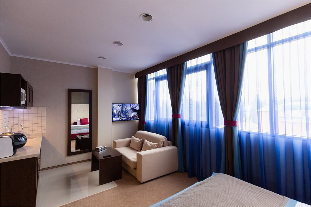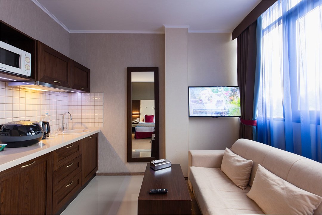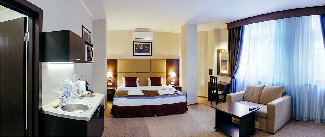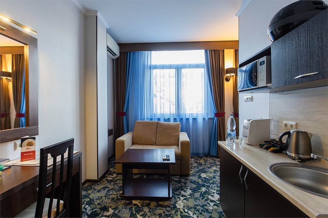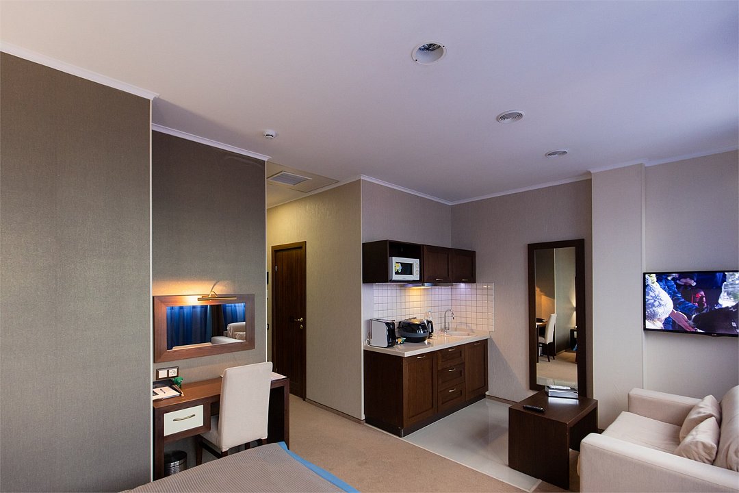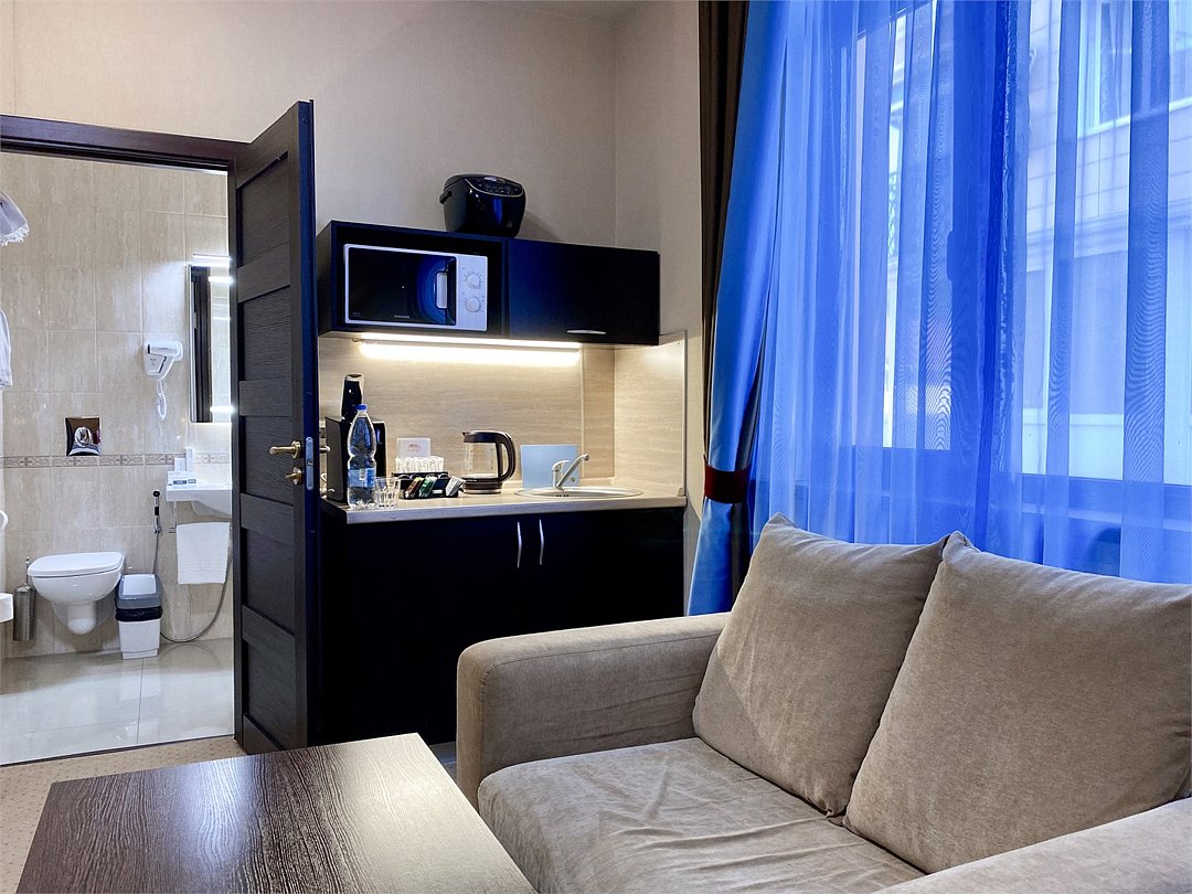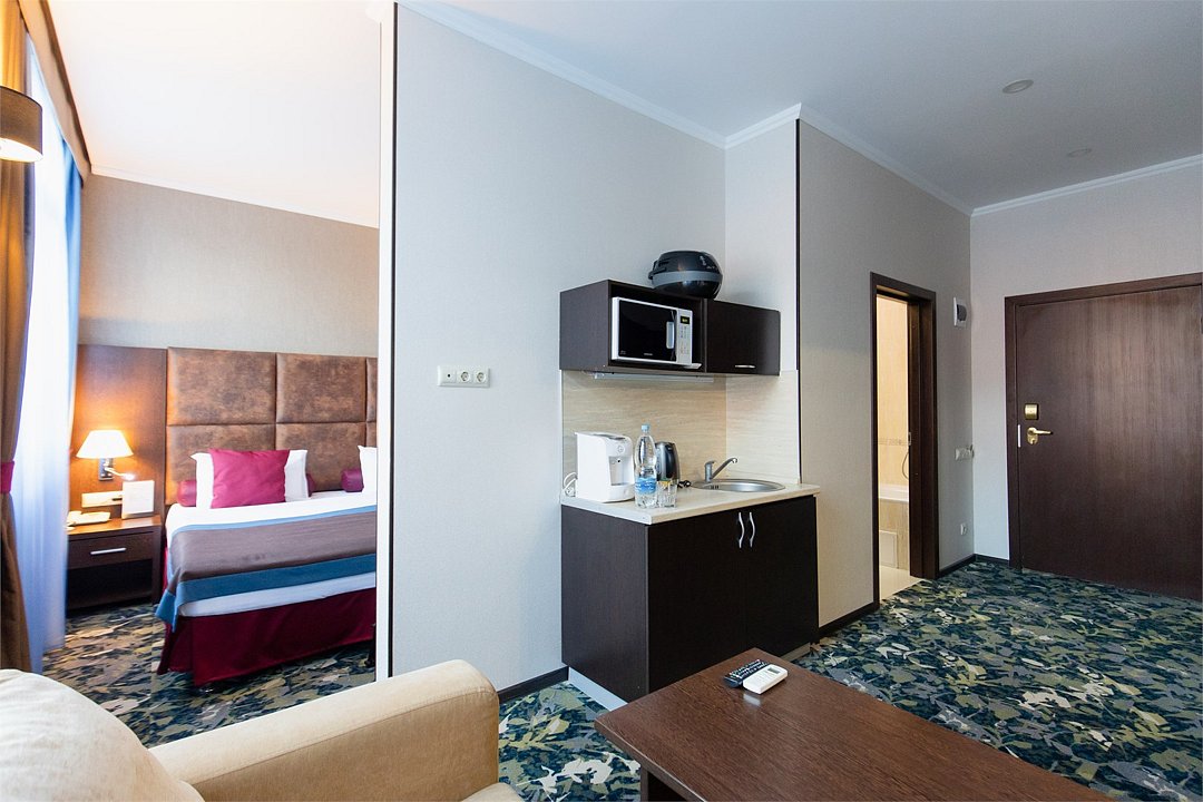 Просторный однокомнатный номер, который имеет гостевую зону с рабочим столом и спальную зону с большой двуспальной кроватью или двумя односпальными кроватями (30 кв.м.), а также кухонную зону, расположенный на 4 или 5 этаже. В номере есть ванная комната с ванной или душевой кабиной с косметическими средствами, фен, тапочки, халат, холодильник, телевизор, кондиционер, гладильная доска, утюг.Услуги и удобства