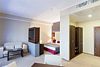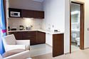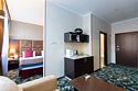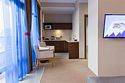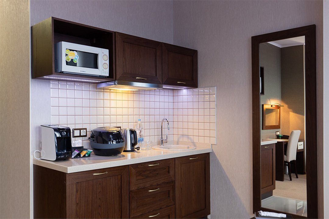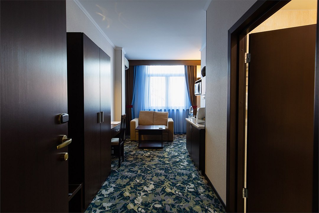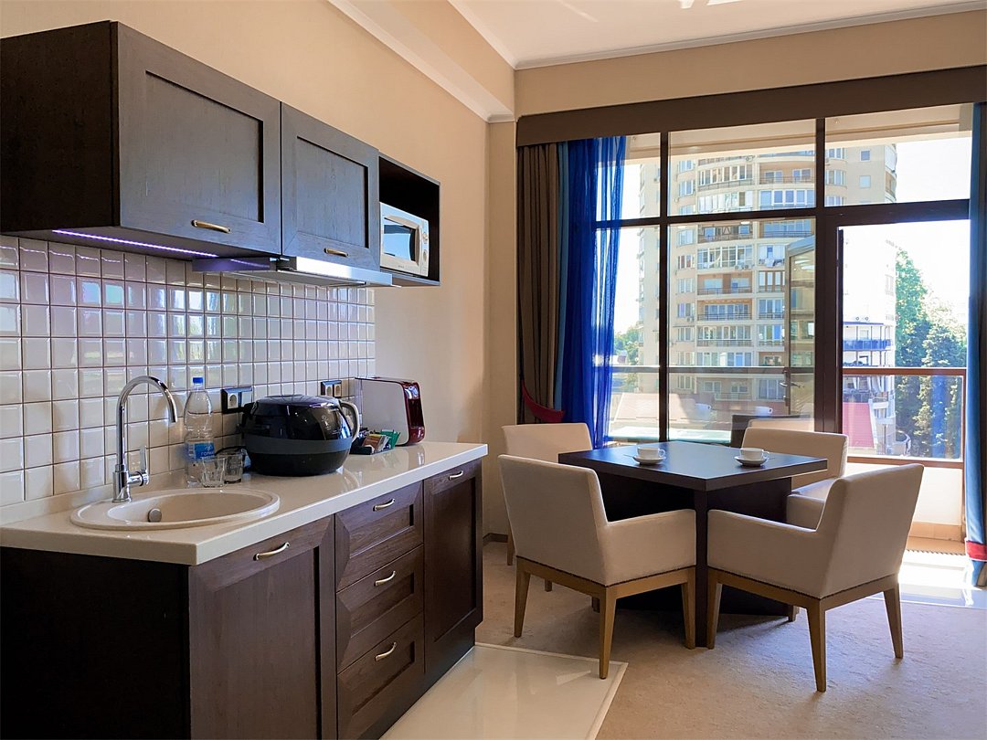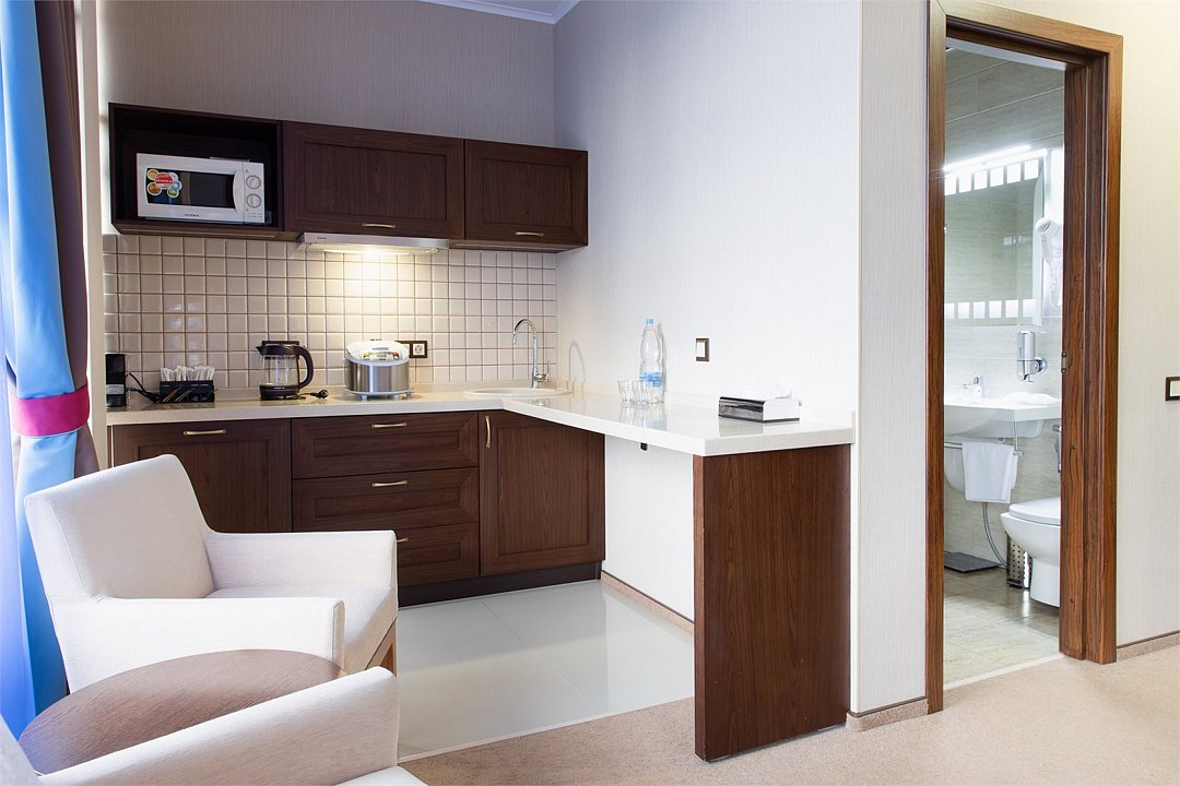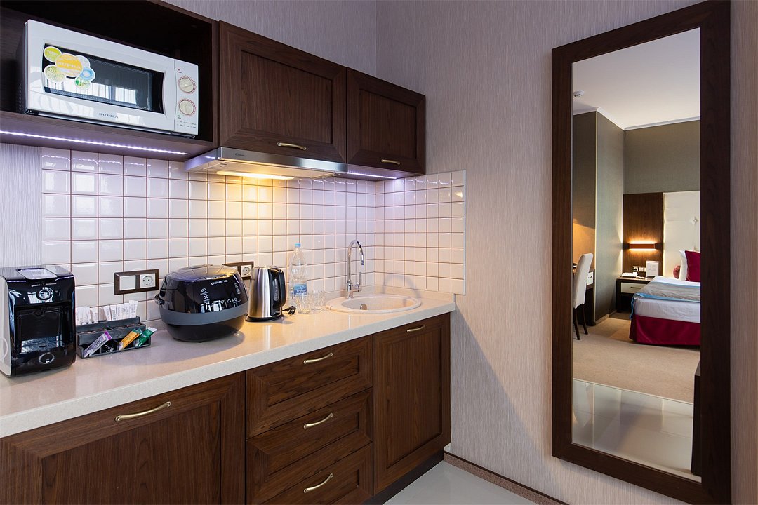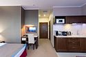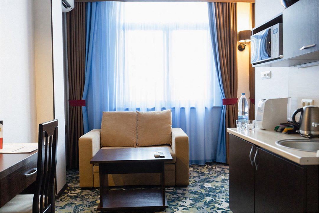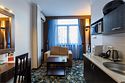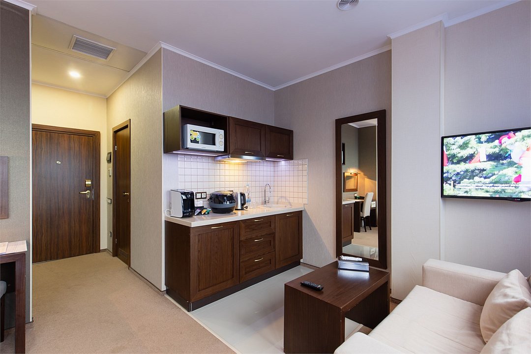 Просторный однокомнатный номер, который имеет гостевую зону с рабочим столом и спальную зону с большой двуспальной кроватью или двумя односпальными кроватями (30 кв.м.), а также кухонную зону, расположенный на 4 или 5 этаже. В номере есть ванная комната с ванной или душевой кабиной с косметическими средствами, фен, тапочки, халат, холодильник, телевизор, кондиционер, гладильная доска, утюг.Услуги и удобства