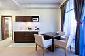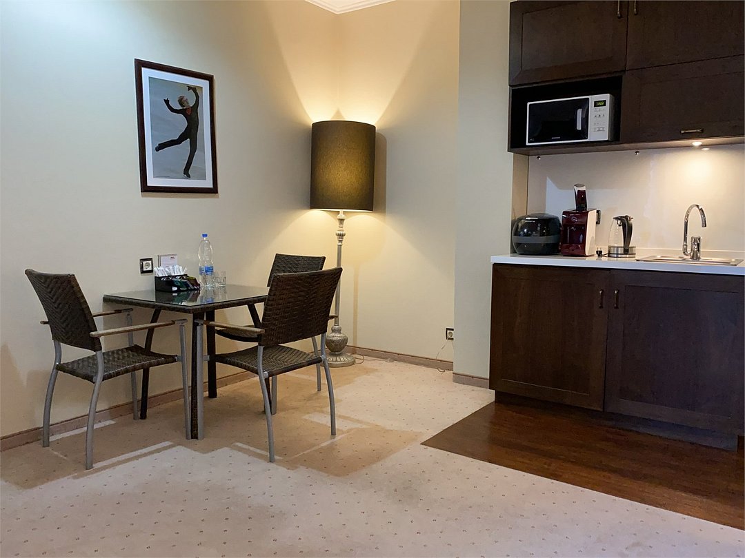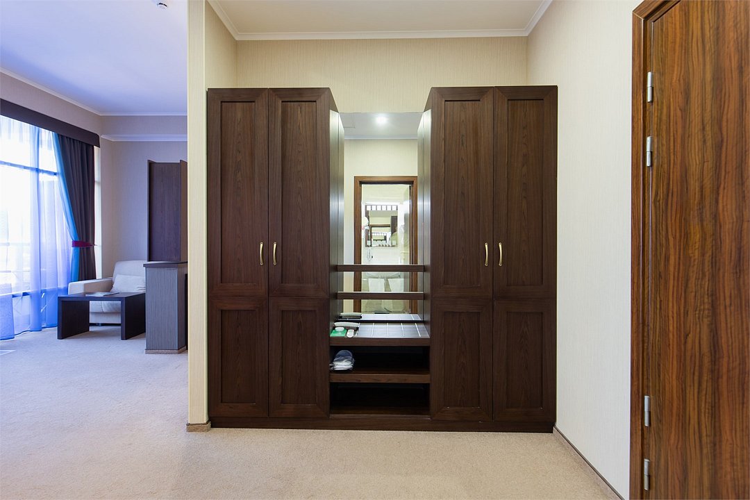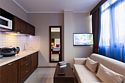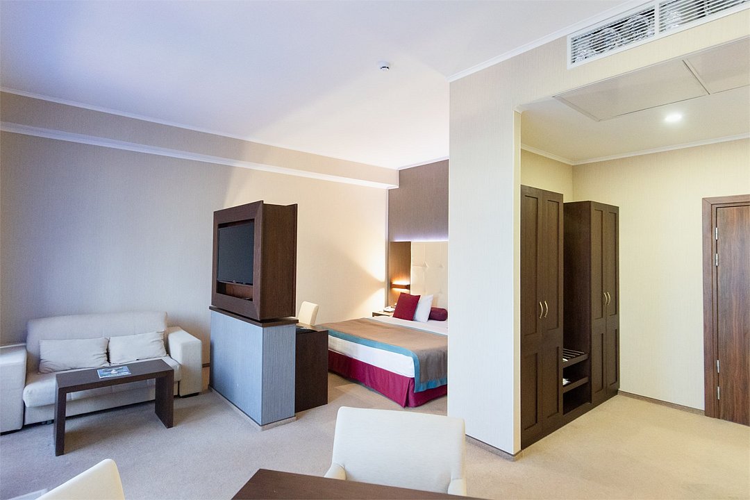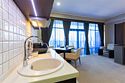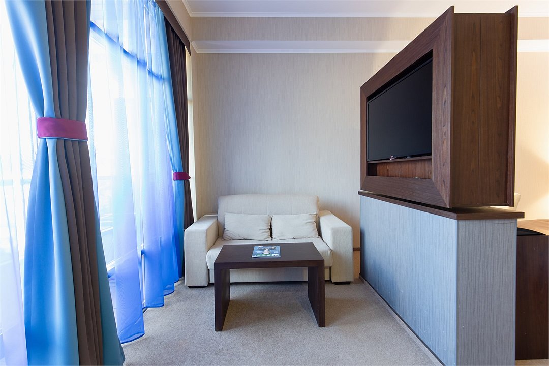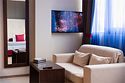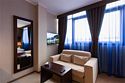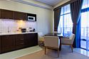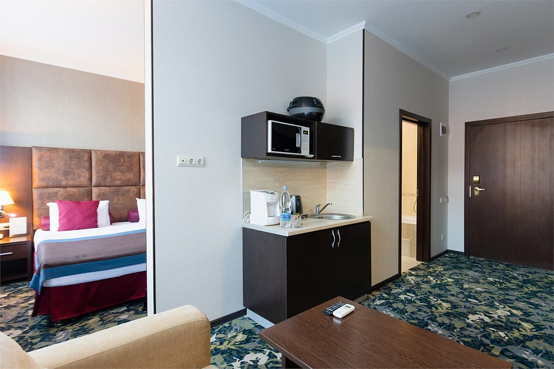 Просторный номер с балконом (40 кв.м.), состоящий из гостиной с рабочей и кухонной зонами и спальни с двуспальной кроватью, а также диван-трансформер. В ванной комнате есть ванна, халат, тапочки, фен, халат, тапочки. В номере есть кондиционер, мини-холодильник, телевизор, чайник, кофемашина, посуда, гладильная доска, утюг.Услуги и удобства