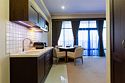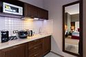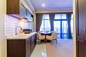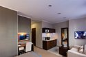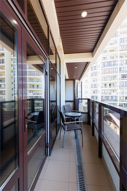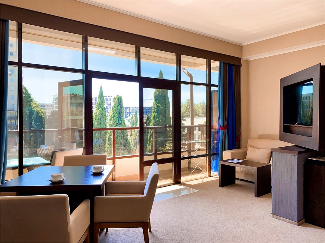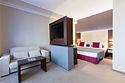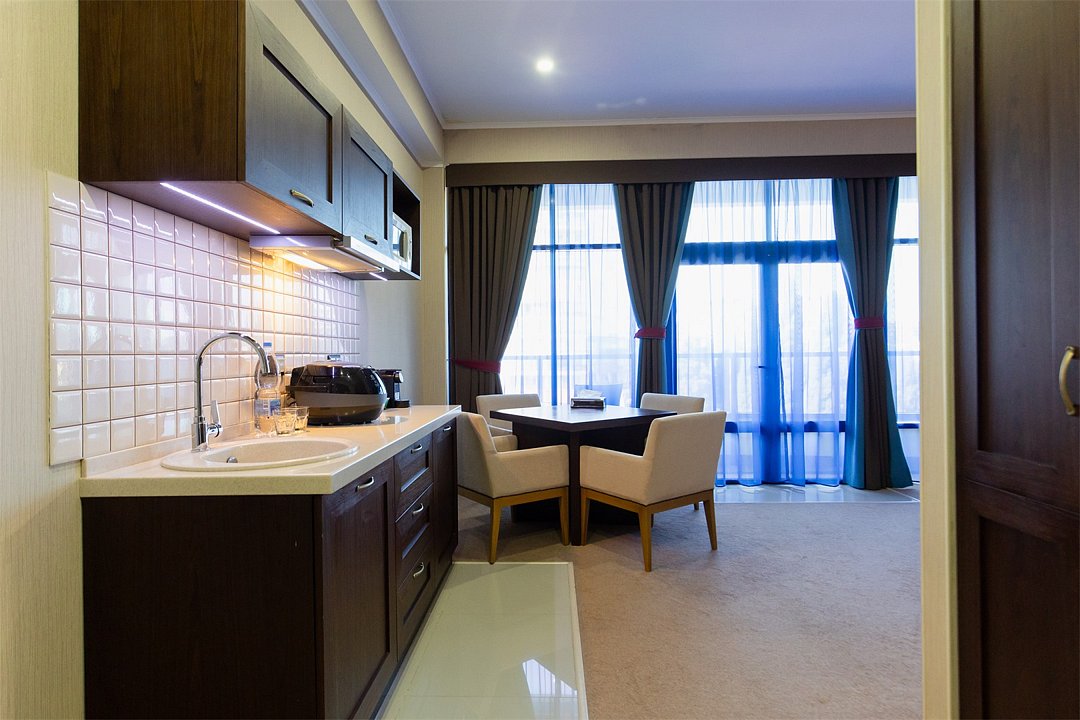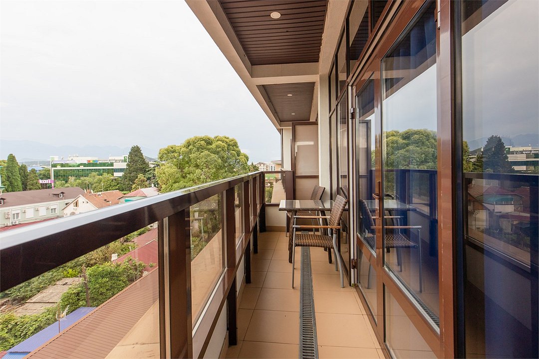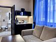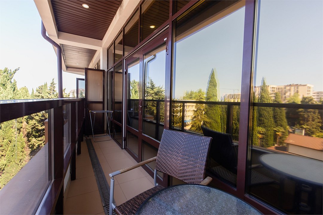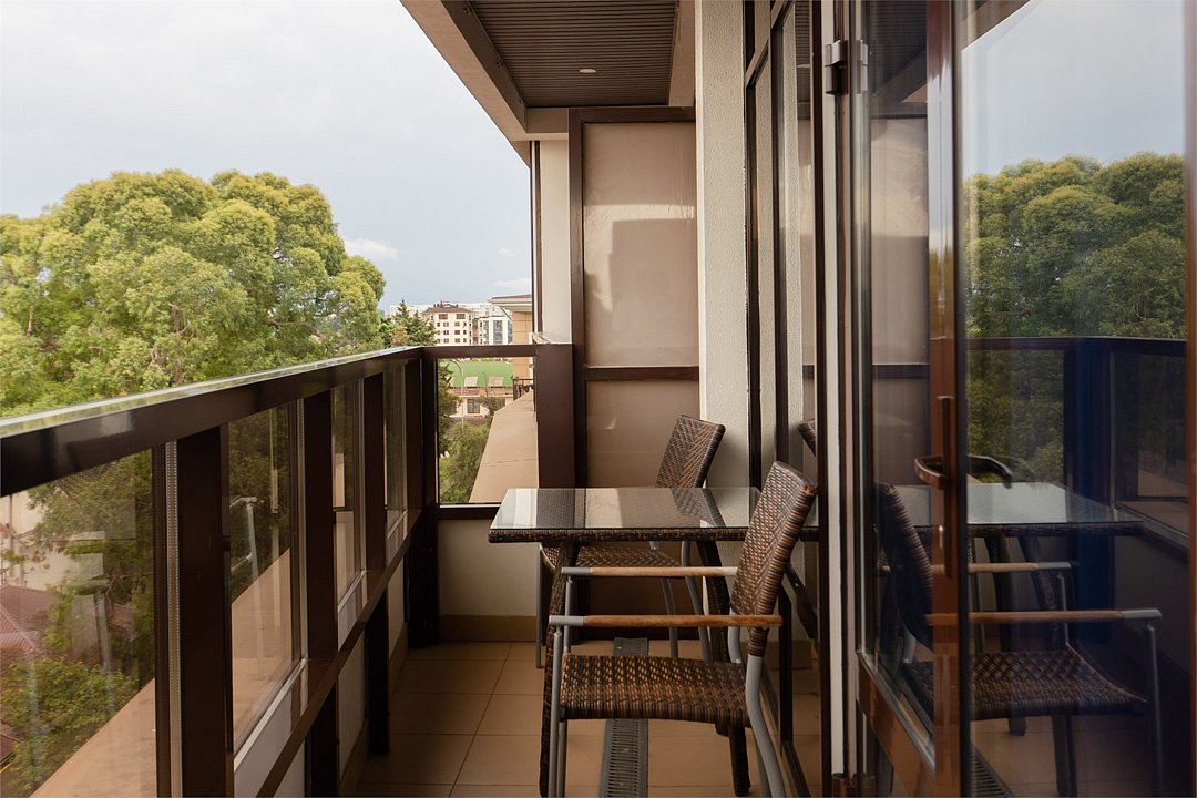 Просторный номер с балконом (40 кв.м.), состоящий из гостиной с рабочей и кухонной зонами и спальни с двуспальной кроватью, а также диван-трансформер. В ванной комнате есть ванна, халат, тапочки, фен, халат, тапочки. В номере есть кондиционер, мини-холодильник, телевизор, чайник, кофемашина, посуда, гладильная доска, утюг.Услуги и удобства