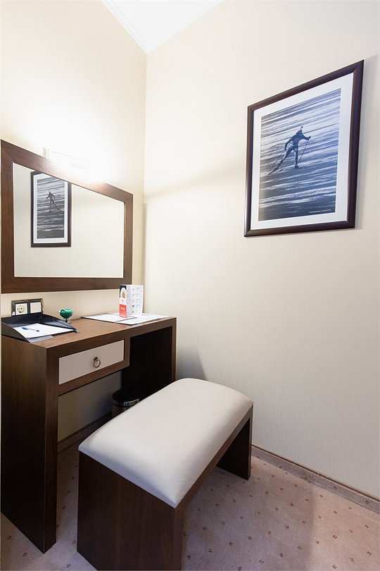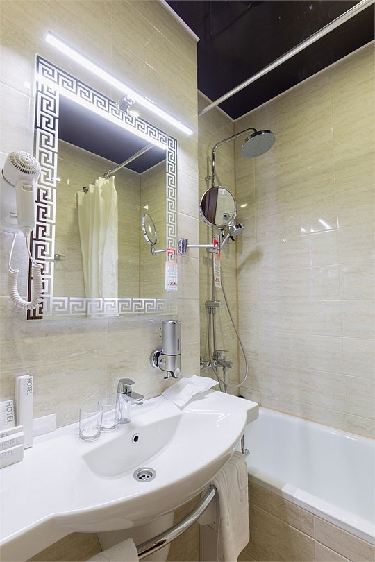 Стильный и современный однокомнатный номер(20 кв.м.), который находится на 2 этаже. В номере одна двуспальная или две односпальных кровати, телевизор, кондиционер, холодильник, рабочий стол, гладильная доска, утюг, ванная комната с душевой кабиной и косметическими средствами, фен, тапочки, халат.Услуги и удобства