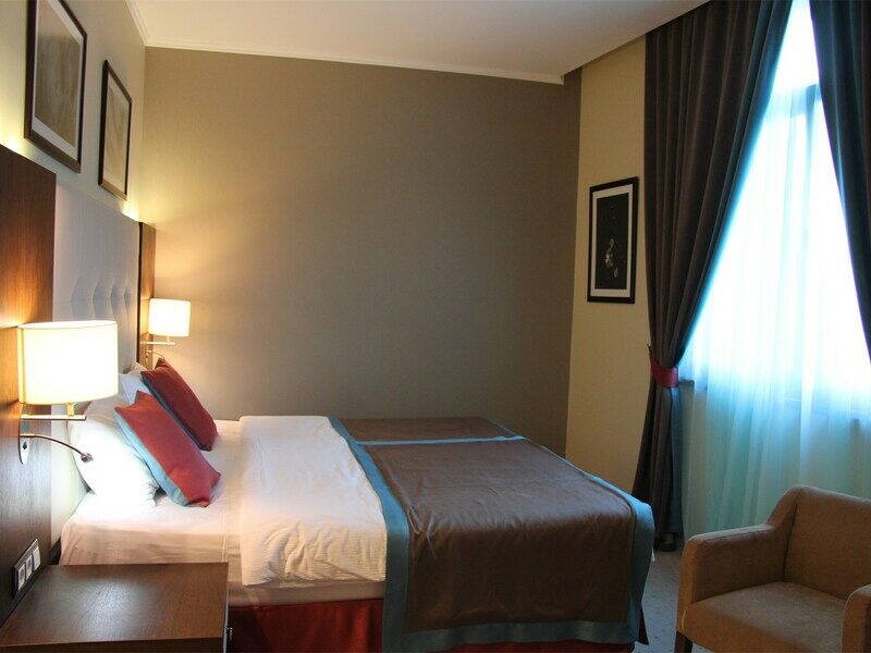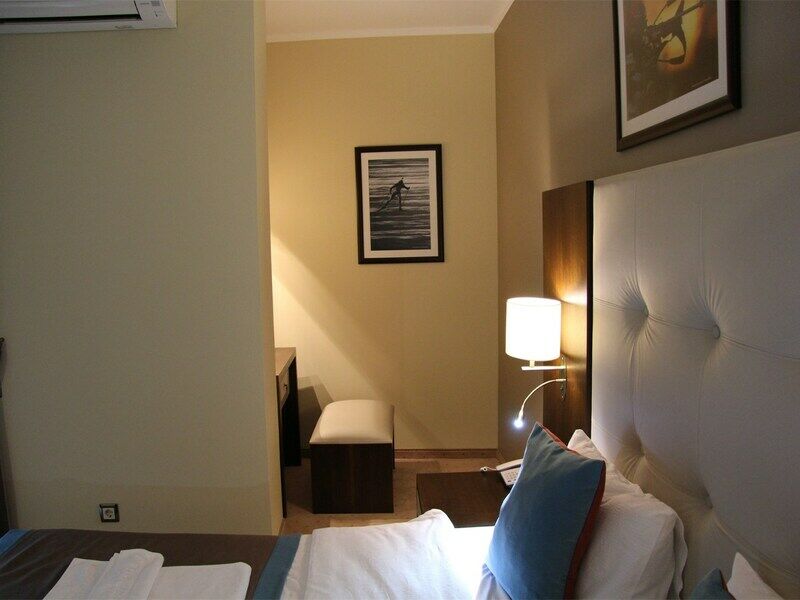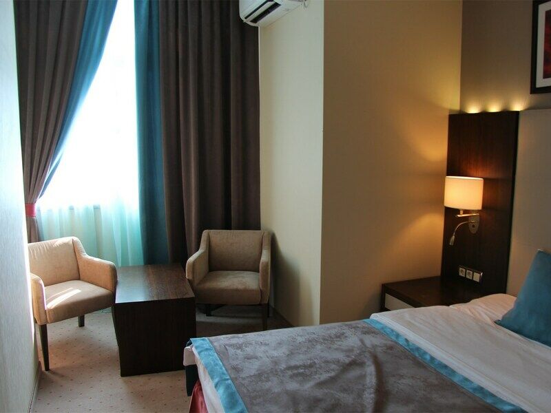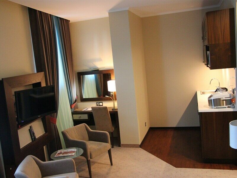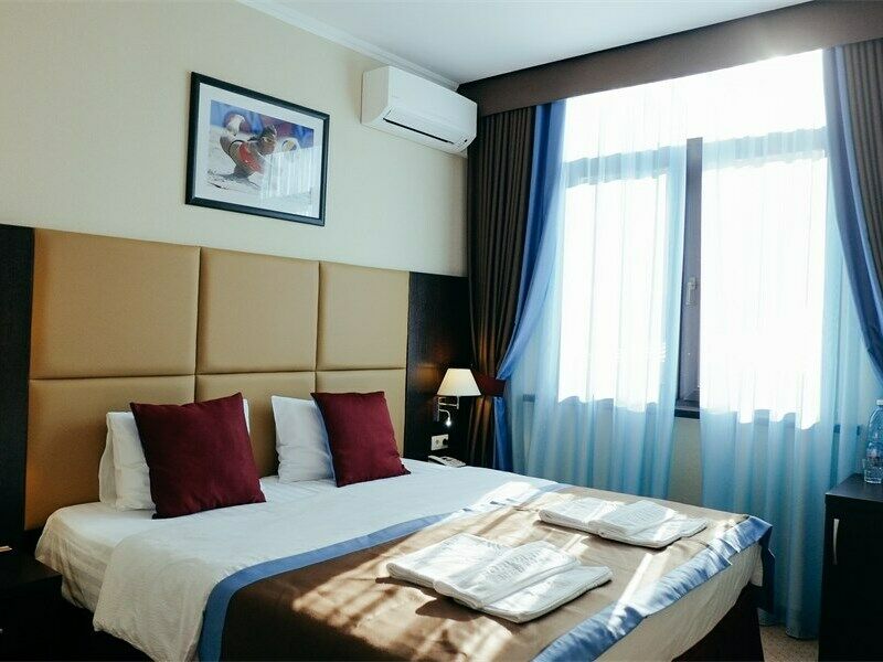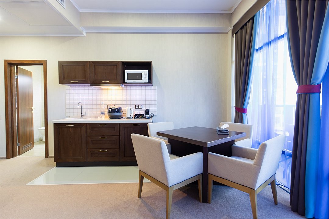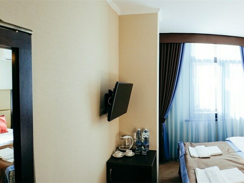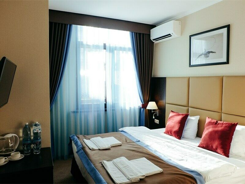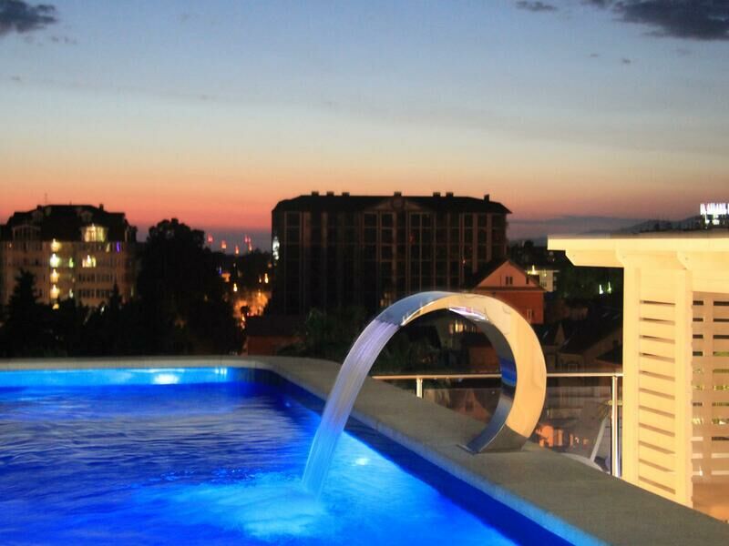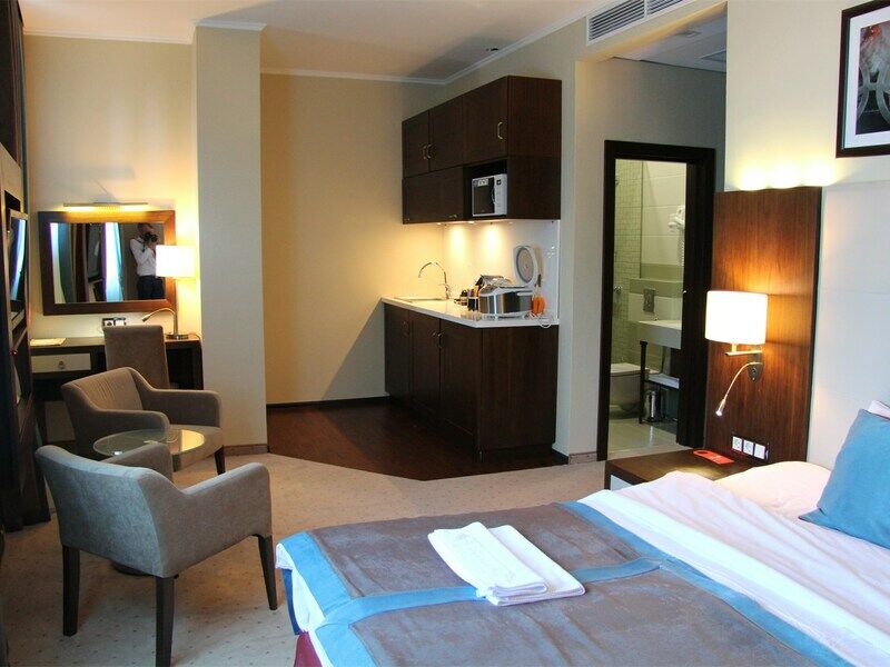 Апартаменты для проживания оснащены всем необходимым для комфортного отдыха. Все номера с Wi-Fi, кондиционером, кофемашиной и чайником. Отель представляет собой 5 этажное здание и включает панорамный бассейн на крыше, современный фитнес-зал, профессиональный турбо-солярий и ресторан. Здесь Вам предложат высокий стандарт уровня сервиса и безопасности.