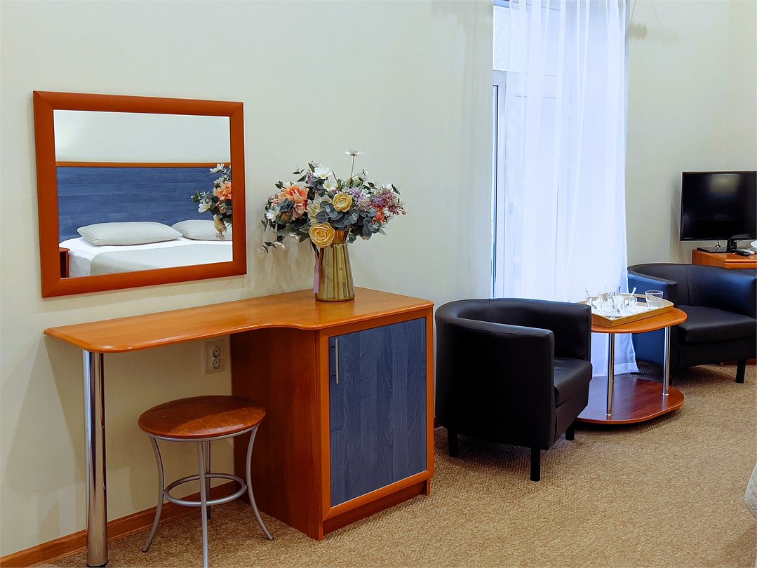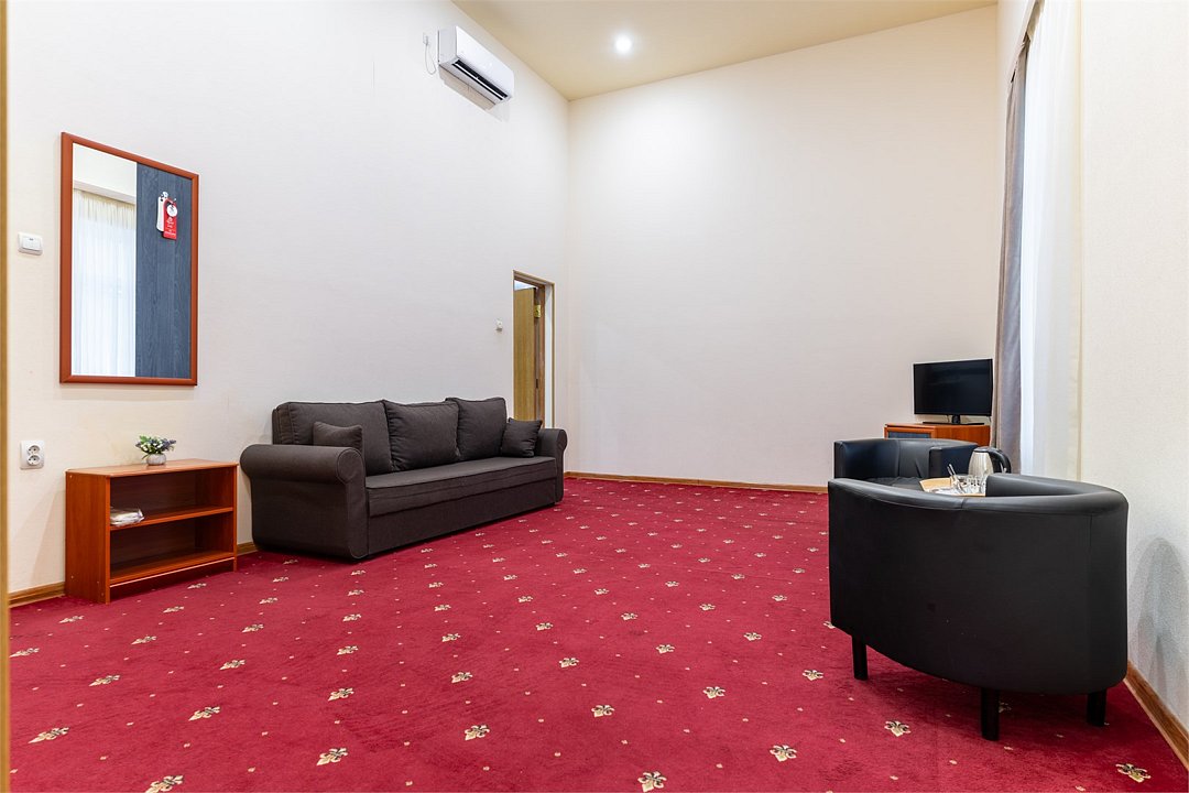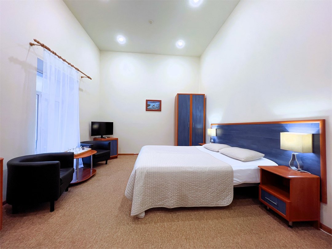 Отель «Фрегат -1» готов предложить гостям двухкомнатный номер категории "Люкс", который подходит для размещения до четырех гостей. Площадь номера до 55 кв. м, что обеспечивает свободное пространство и уютную обстановку. Дети до 5 лет могут проживать в номере бесплатно. Номер оформлен в классическом стиле, что создает атмосферу уюта. В номере имеется все необходимое для удобного время препровождения, включая удобную мебель, кондиционер, телевизор , холодильник, Wi-Fi, фен, полотенца. Номер оборудован полноценной ванной, что придает особую роскошь отдыху! Идеальный выбор для людей, ценящих максимальный комфорт.Услуги и удобства