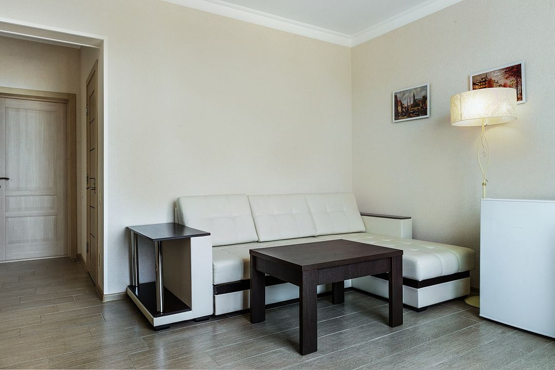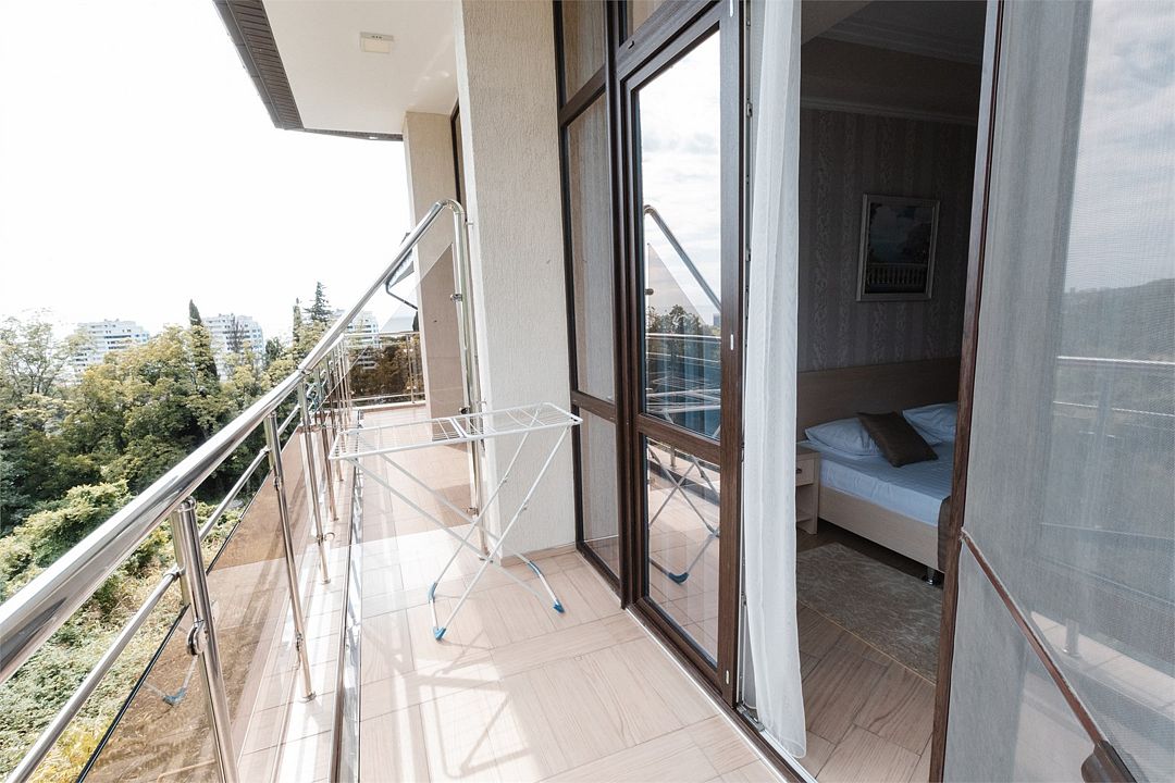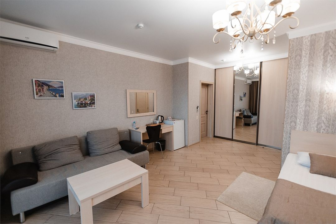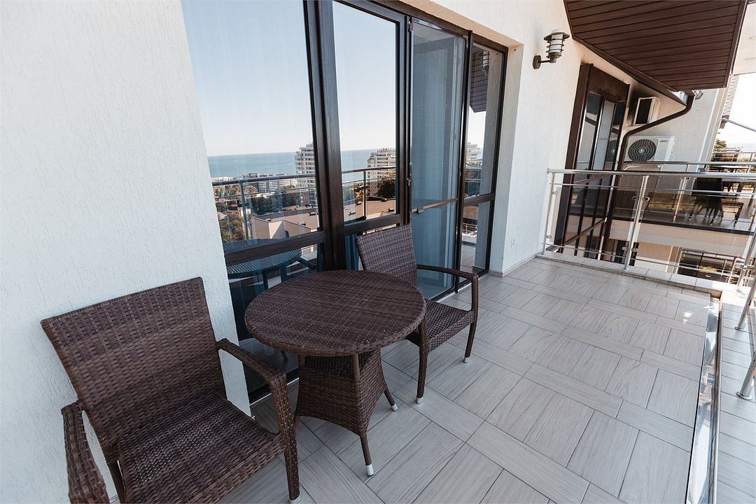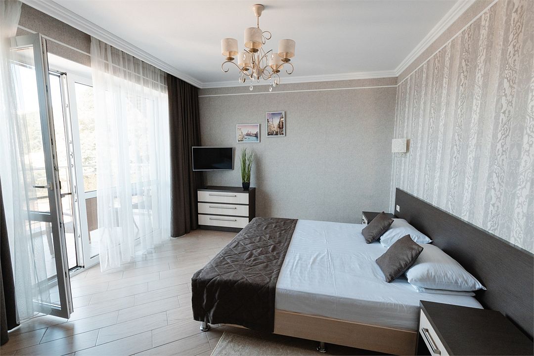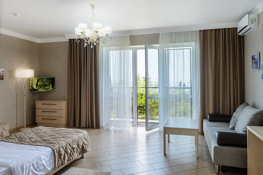 Комфортный двухкомнатный номер с балконом-террасой с прекрасным панорамным видом на море и горы. Большая двуспальная кровать и двухместный раскладной диван-кровать в гостиной. В каждом номере холодильник, электрочайник с чайным набором, фен, мыльные принадлежности. Также в качестве дополнительного места для 5-го гостя может быть установлена евро-раскладушка с жестким дном и ортопедическим матрацем.Услуги и удобства