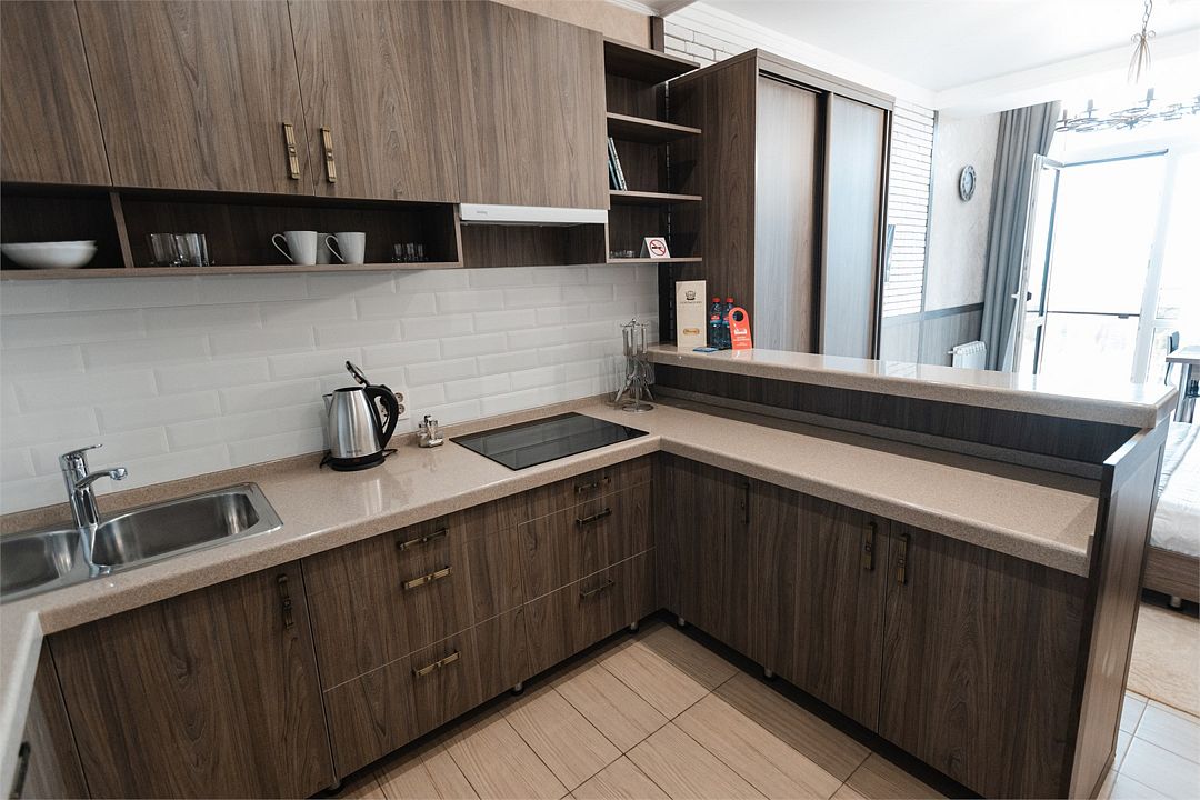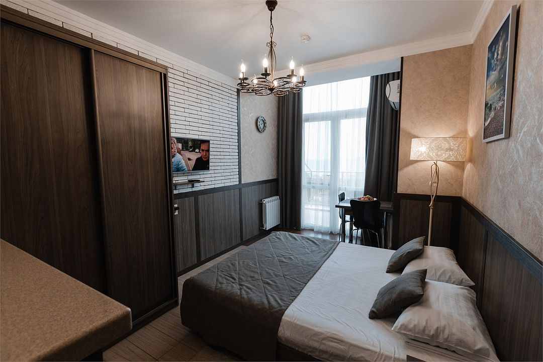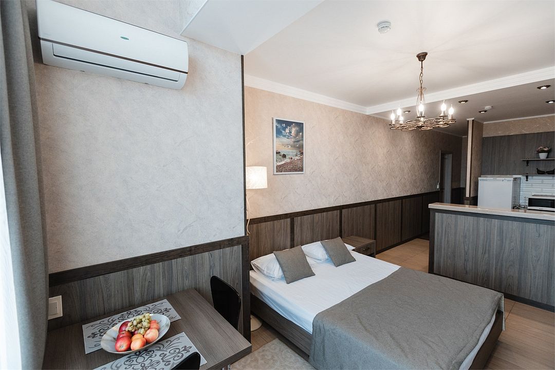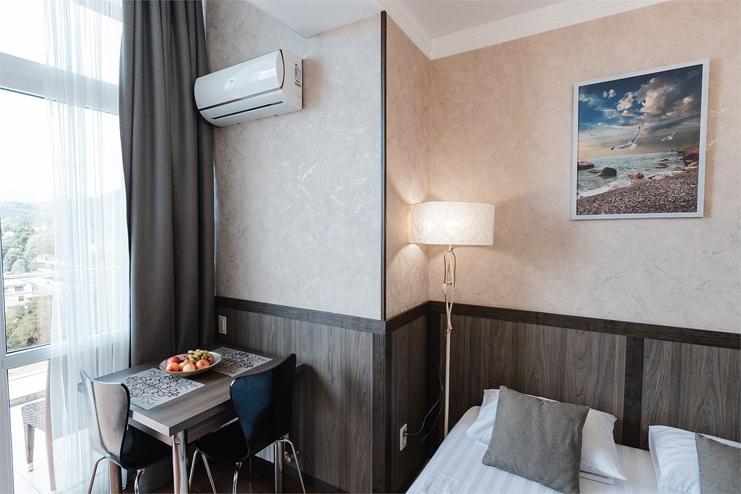 Студия с балконом-террасой с панорамным видом на море и горы. Наличие полностью оборудованной кухни и комплектации для максимально комфортного отдыха вдвоем или с маленьким ребенкомУслуги и удобства