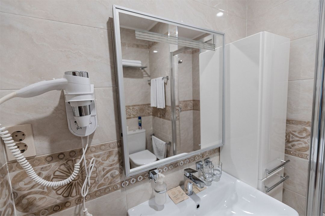 Wi-Fi, кондиционер, ванная комната, душевая кабина, санузел, кровать «King size», двуспальная кровать, две односпальные кровати, диван, шкаф для одежды, гардеробная, вешалки, багажная тумба, зеркало, сейф, вид на город, кресло, вид во двор, стул, туалет, телевизор с плоским экраном, шкаф-купе, без питомцевВ гостиничном номере