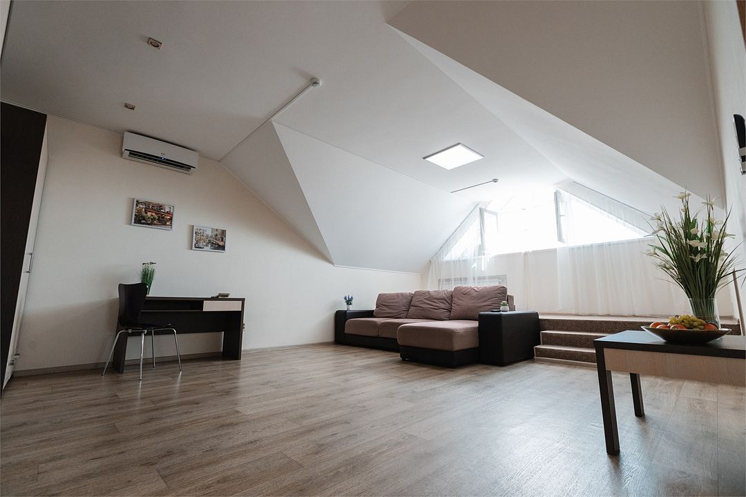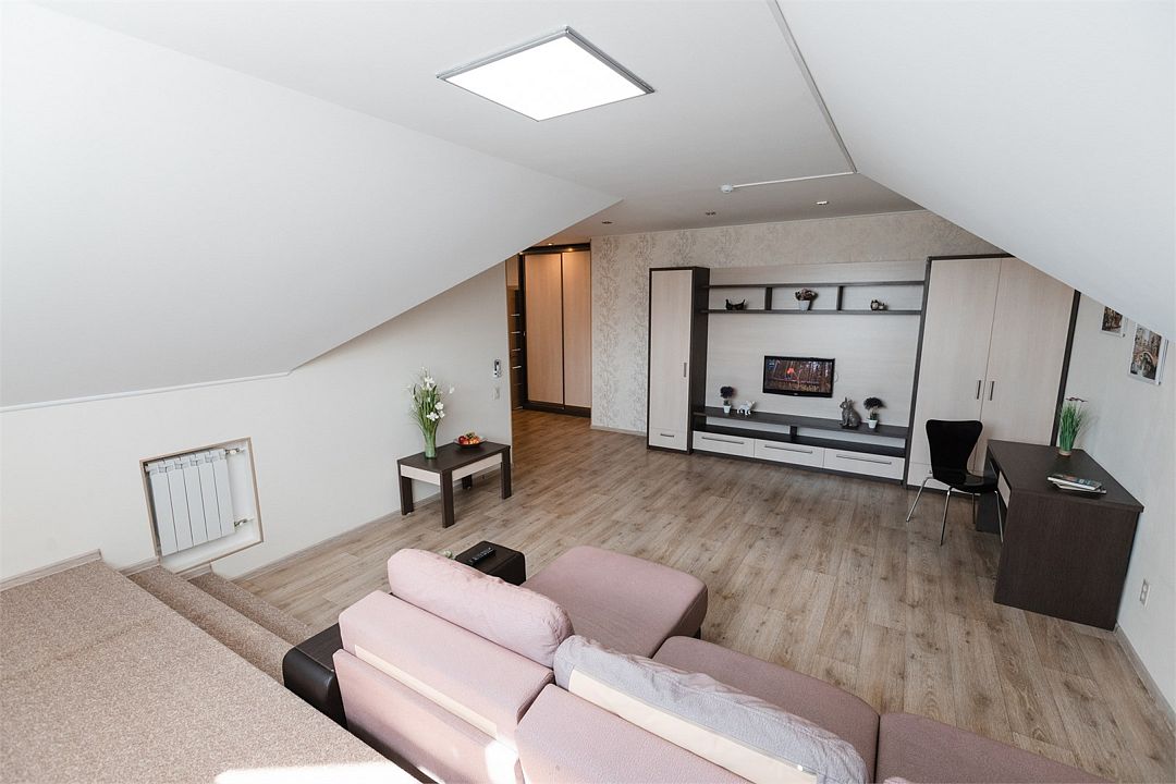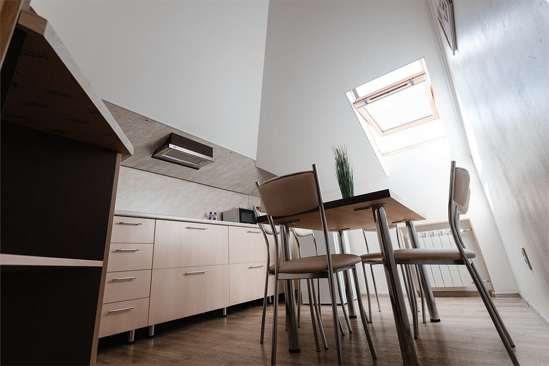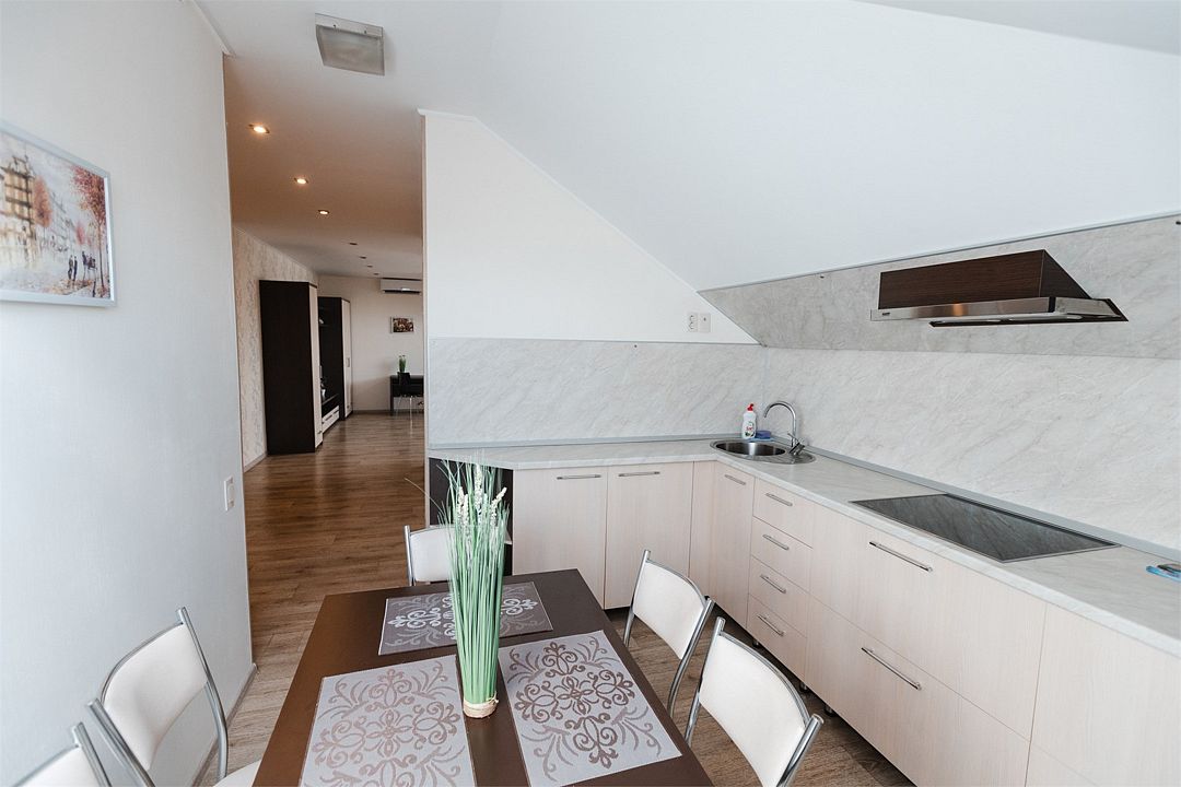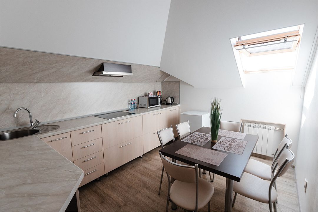Апартаменты на мансардном этаже. Полностью оборудованная кухня на 4 человека. Холодильник, индукционная печь, микроволновая печь. Большая двуспальная кровать и двухместный раскладной диван-кровать в гостиной. В каждом номере холодильник, электрочайник с чайным набором, фен, мыльные принадлежности. Также в качестве дополнительного места для 5-го гостя может быть установлена евро-раскладушка с жестким дном и ортопедическим матрацем.Услуги и удобства