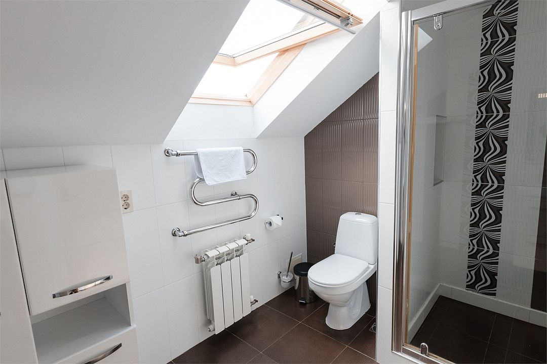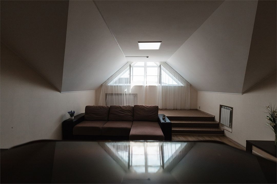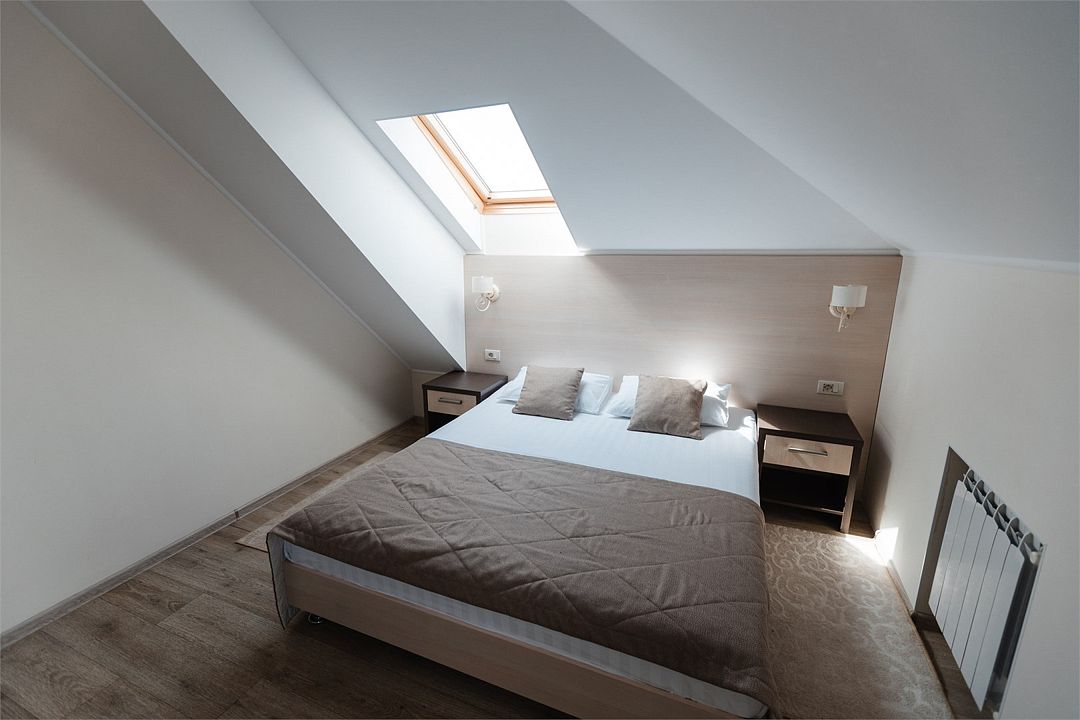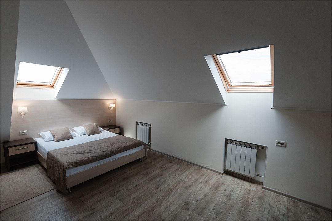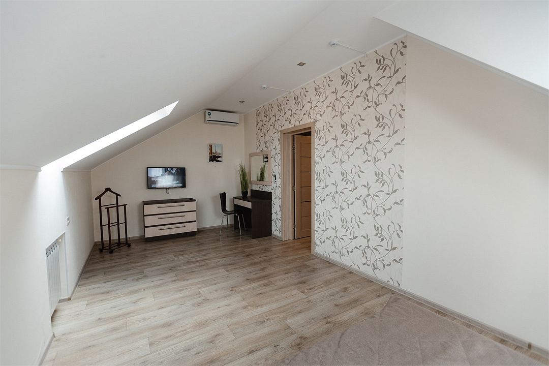 Апартаменты на мансардном этаже. Полностью оборудованная кухня на 4 человека. Холодильник, индукционная печь, микроволновая печь. Большая двуспальная кровать и двухместный раскладной диван-кровать в гостиной. В каждом номере холодильник, электрочайник с чайным набором, фен, мыльные принадлежности. Также в качестве дополнительного места для 5-го гостя может быть установлена евро-раскладушка с жестким дном и ортопедическим матрацем.Услуги и удобства