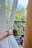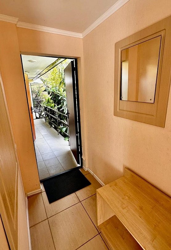 Имеется антимоскитная сетка, плотные шторы, телевизор, кондиционер, шкаф, вешалка, рабочий стол, журнальный стол, посуда, столовые приборы, чайник, холодильник, стулья.