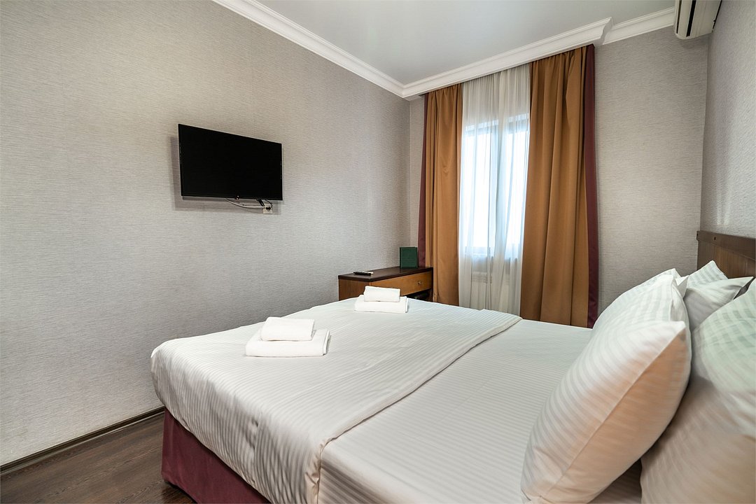 телевизор, кабельное телевидение, Wi-Fi, кондиционер, фен, тапочки, гигиенические средства, односпальная кровать, шкаф для одежды, письменный стол, сейф, раковина, питьевая вода, душ, стаканы, тумба, туалет, внутренний телефон, мини-холодильник, номер для некурящих, чайная станция, уборка номера, можно с питомцамиВ гостиничном номере