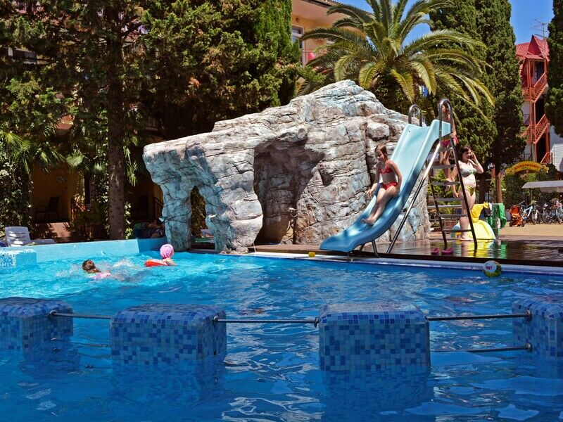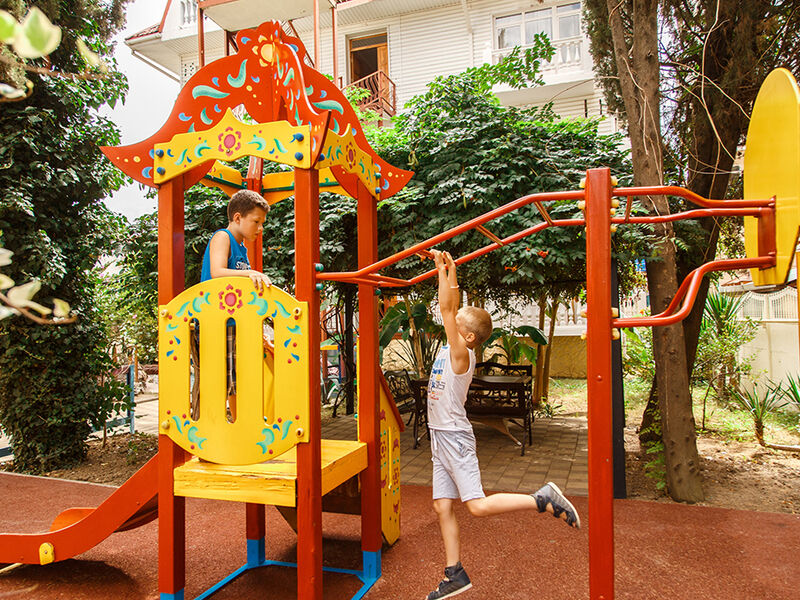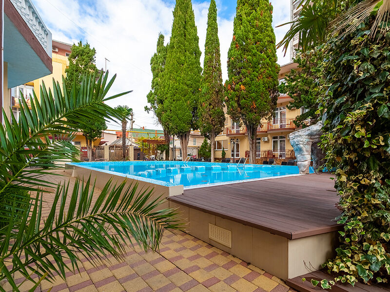 Отель на 250 мест расположен на озелененной и прекрасно оборудованной собственной территории с автостоянкой, открытым подогреваемым пресноводным бассейном с детским отделением, зоной солярия и игровой площадкой во внутреннем дворе комплекса.