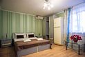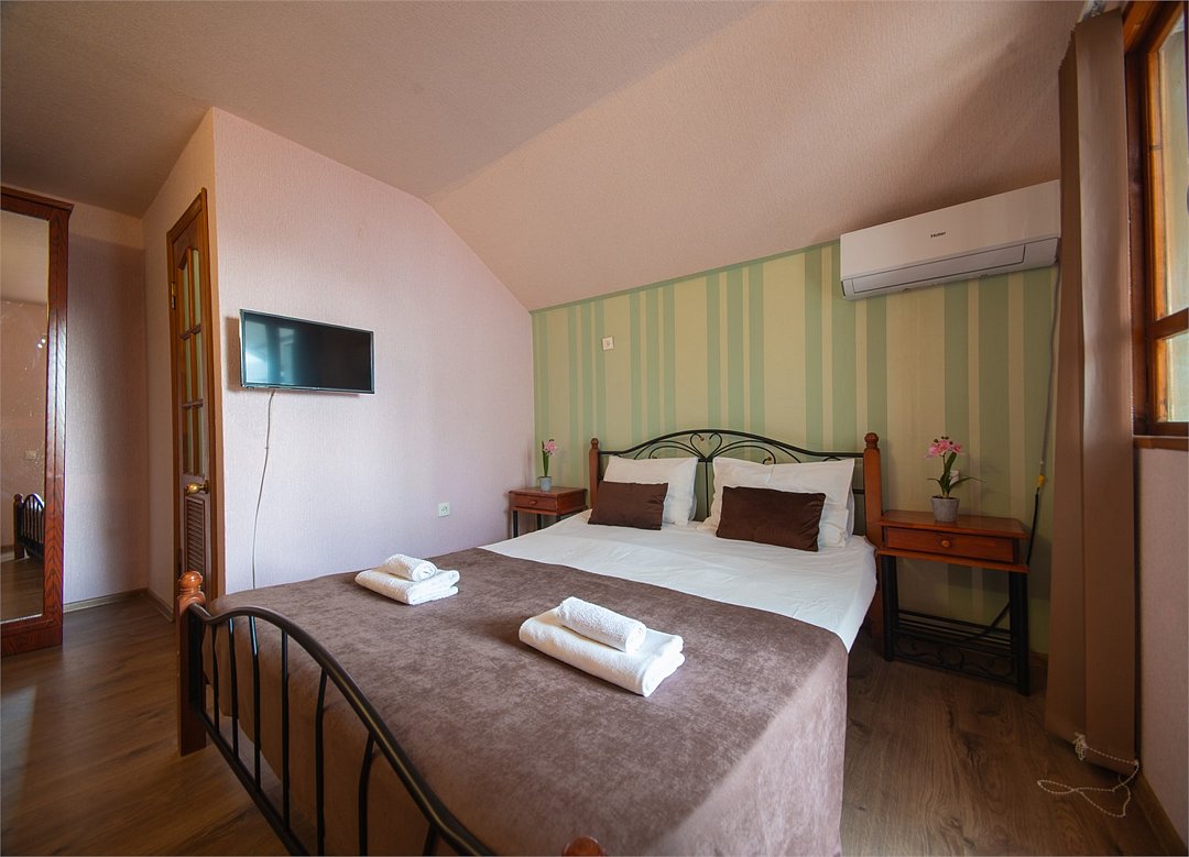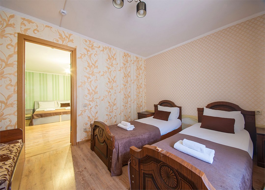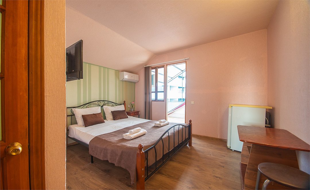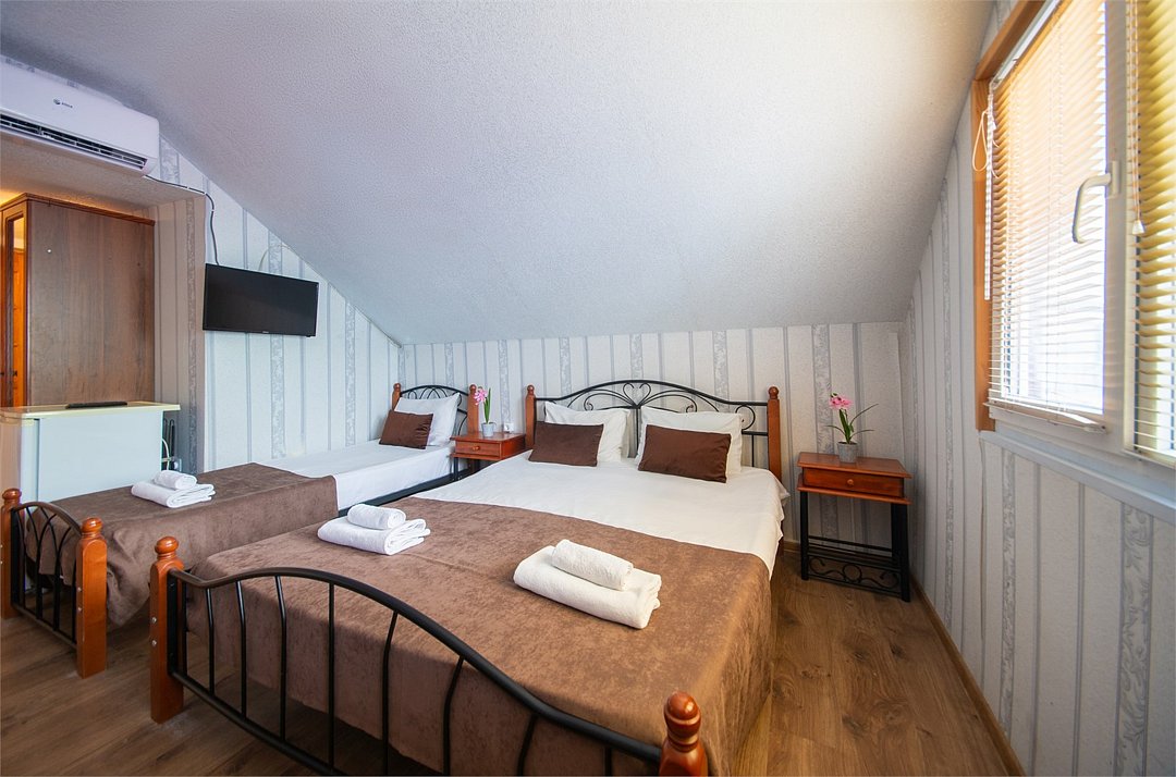 телевизор, Wi-Fi, холодильник, кондиционер, фен, балкон, двуспальная кровать, две односпальные кровати, тумбы, шкаф для одежды, журнальный столик, чайник, унитаз, раковина, душ, вид во двор, кресло-кроватьВ гостиничном номере