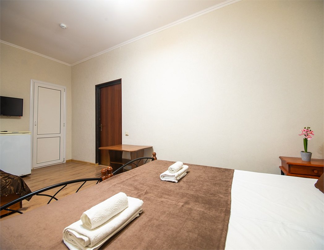 телевизор, Wi-Fi, холодильник, кондиционер, фен, двуспальная кровать, две односпальные кровати, тумбы, шкаф для одежды, журнальный столик, чайник, унитаз, раковина, душ, вид во дворВ гостиничном номере