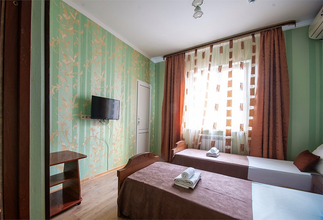 телевизор, Wi-Fi, холодильник, кондиционер, фен, две односпальные кровати, тумбы, шкаф для одежды, журнальный столик, чайник, унитаз, раковина, душ, вид во дворВ гостиничном номере