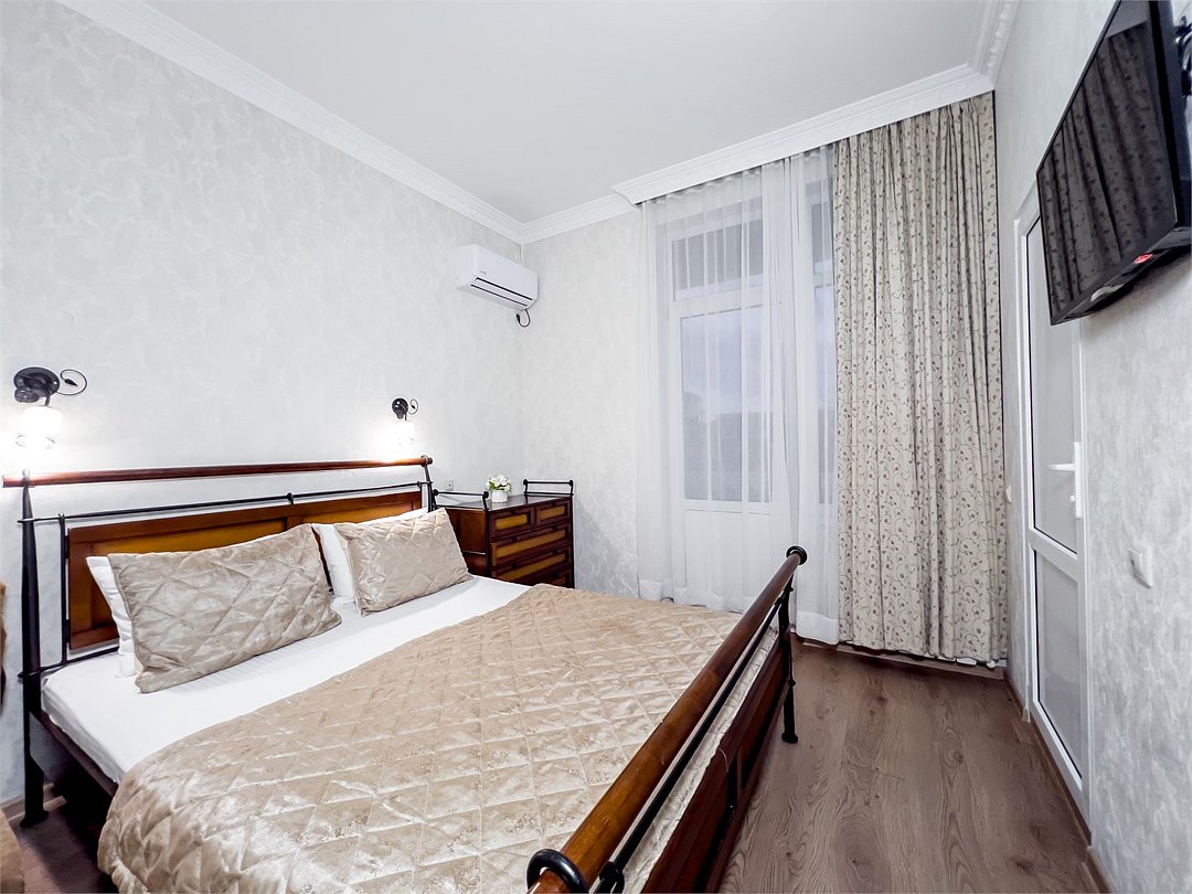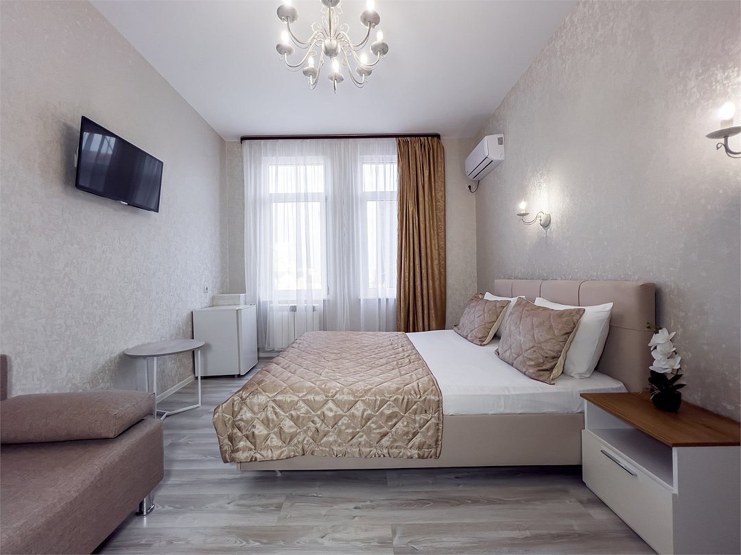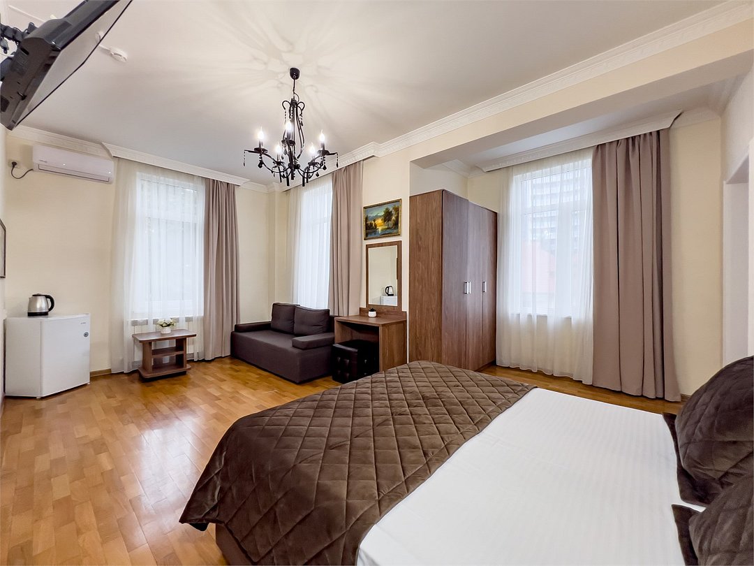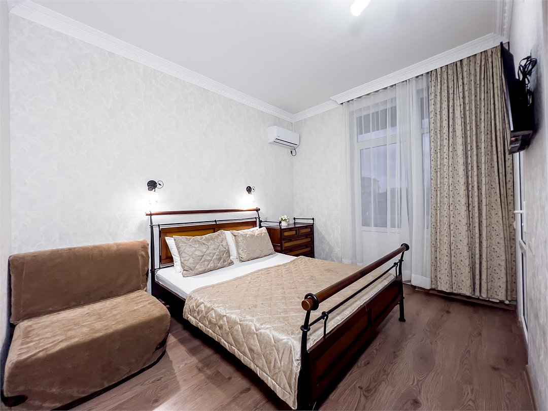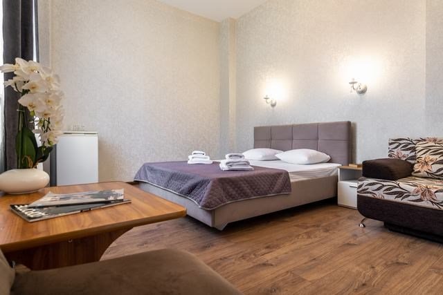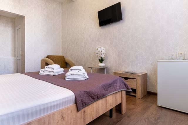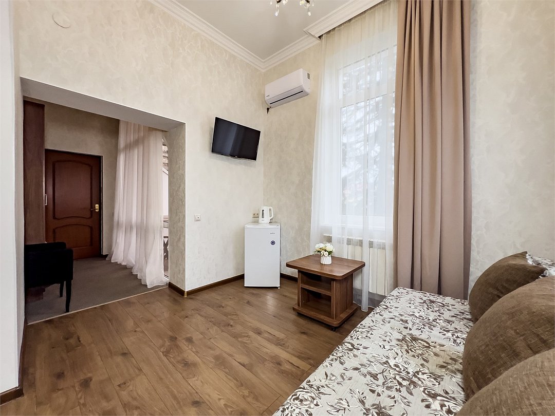 Удобные и уютные номера категории «Комфорт» вместимостью до 3 гостей, идеально подойдут как для отдыха, так и для деловых поездок. Все номера оснащены двуспальной кроватью и кресло-кроватью, телевизорам, кондиционерам, холодильникам и имеют бесплатный доступ к сети Wi-Fi.Услуги и удобства