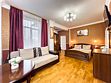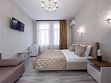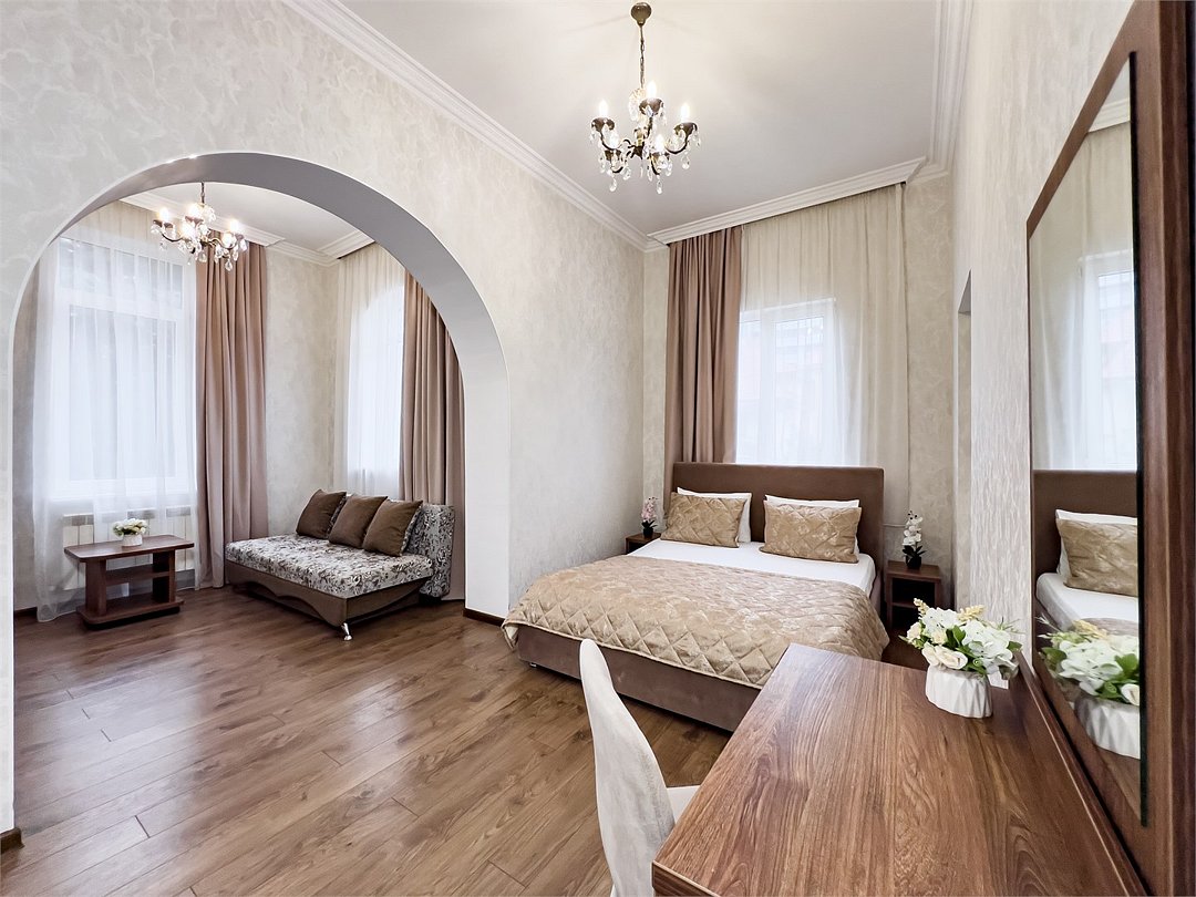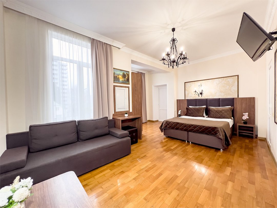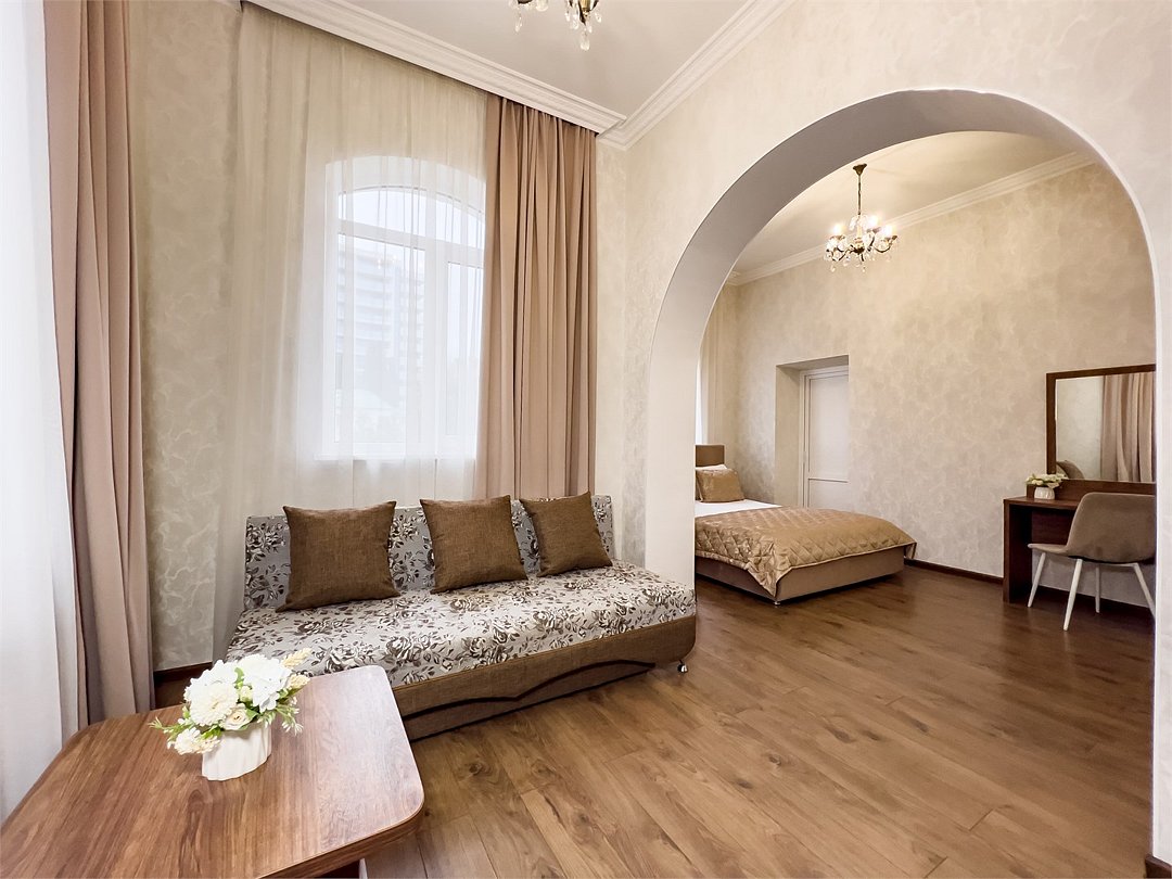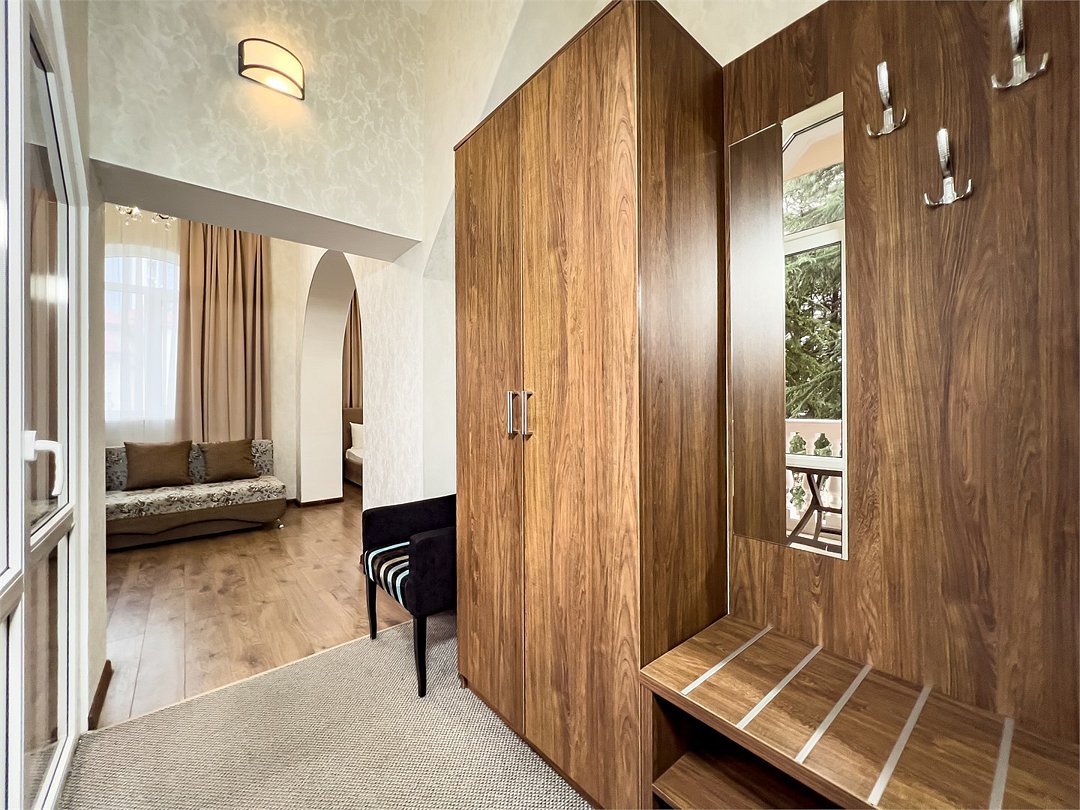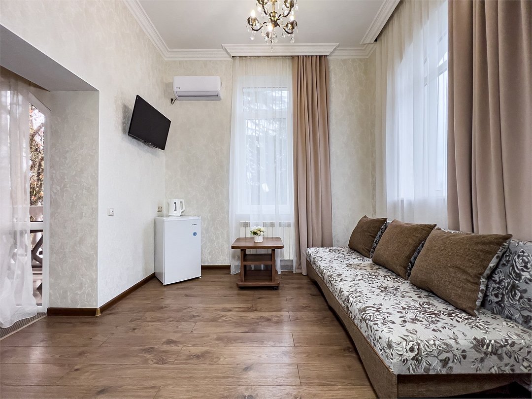 Номер рассчитан для размещения до шести гостей. Номер оснащен одной двухспальной кроватью и одним/двумя двухспальным диваном, шкафом для одежды, прикроватными тумбочками, журнальным или косметическим столиком, зеркалом. Для комфортного отдыха в номере имеется: сплит-система, мини-холодильник, телевизор, постельное белье, полотенца для лица, тела, ног и фен,тапочки. В зимнее время работает отопление.Услуги и удобства