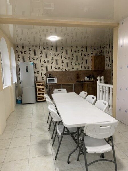 На территории гостевого дома есть холодильник. Также есть общая кухня с микроволновой печью, чайником и обеденным столом.