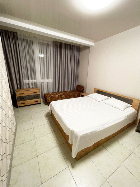 Двуспальная кровать, двухместный диван как основное место, шкаф, зеркало, стол, стулья, тумбочки, с/у, ТВ.