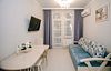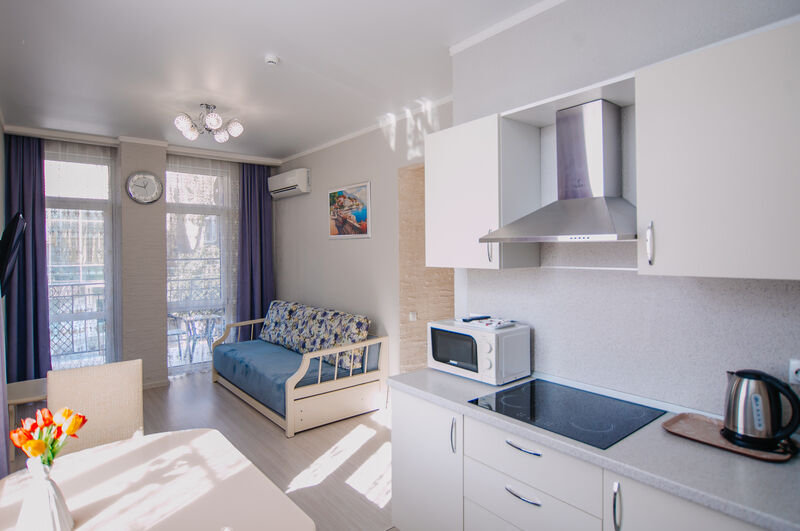 В апартаментах есть мини-кухня, оборудованная бытовой техникой, посудой и столовой зоной. Гости могут готовить еду самостоятельно или ходить в кафе и ресторан поблизости.