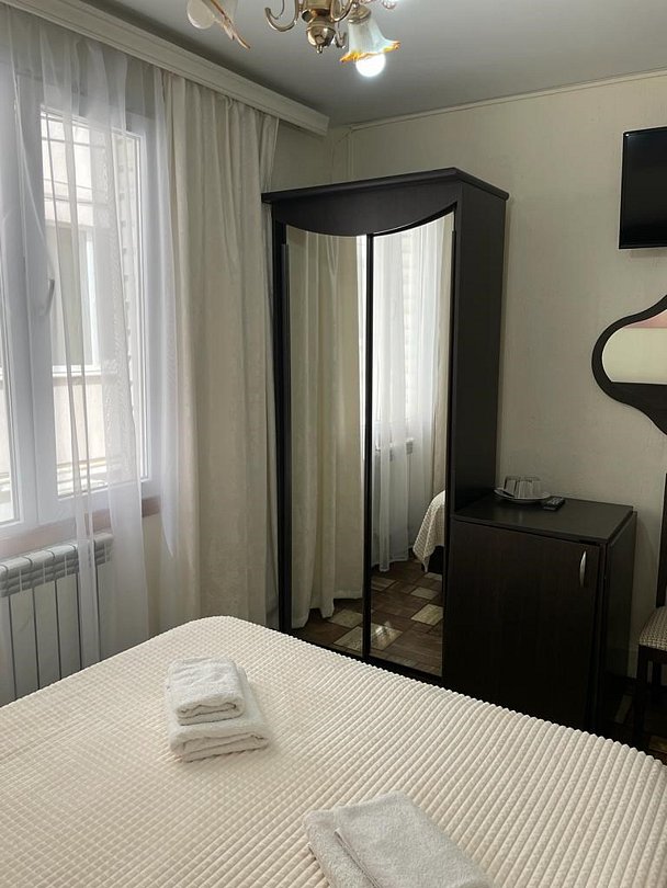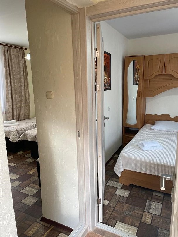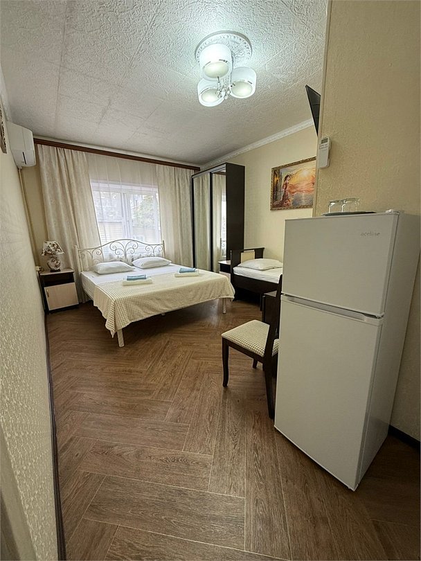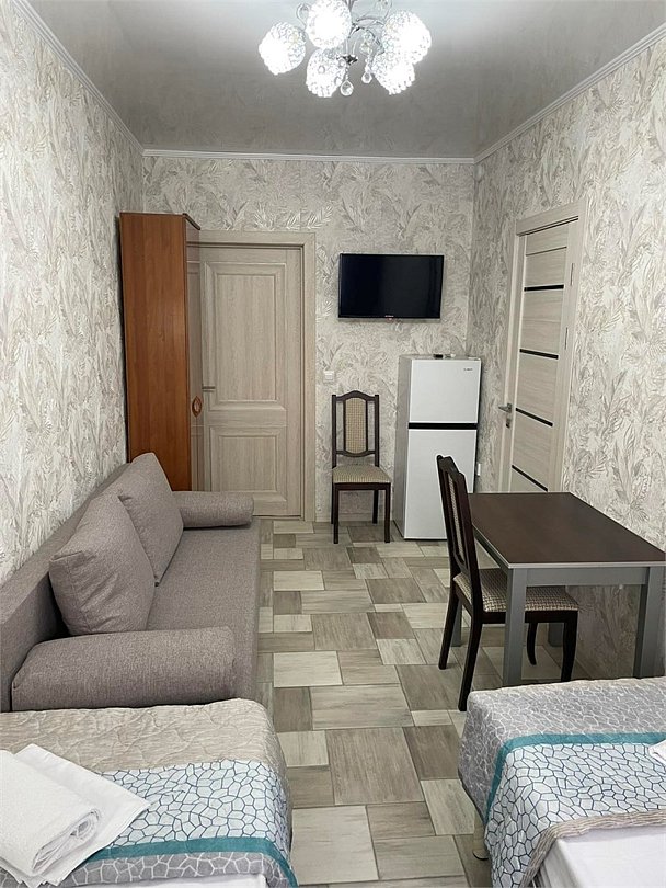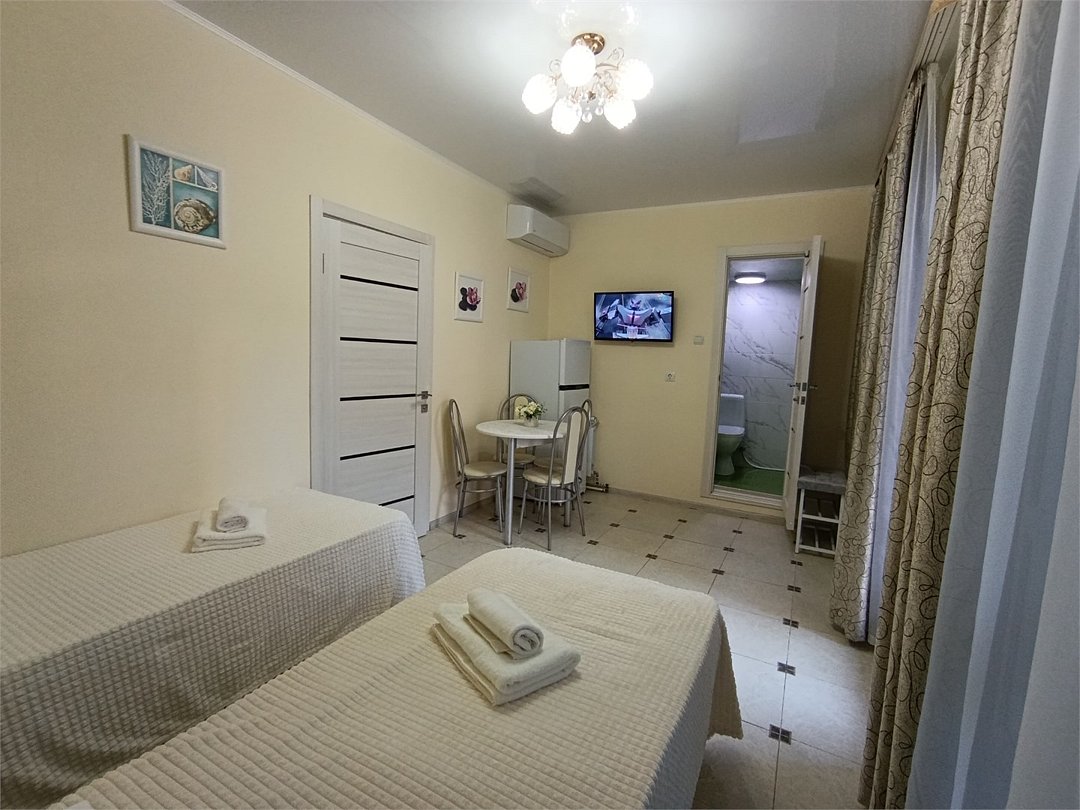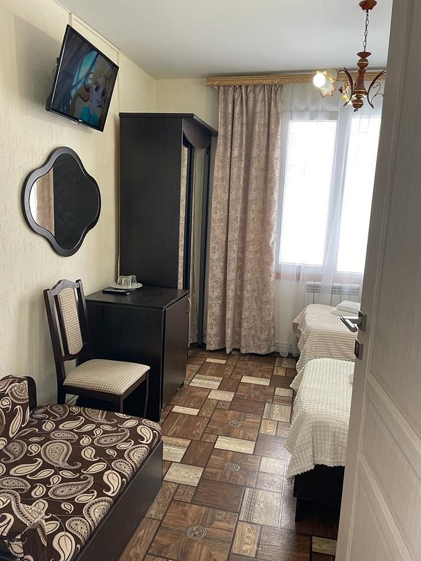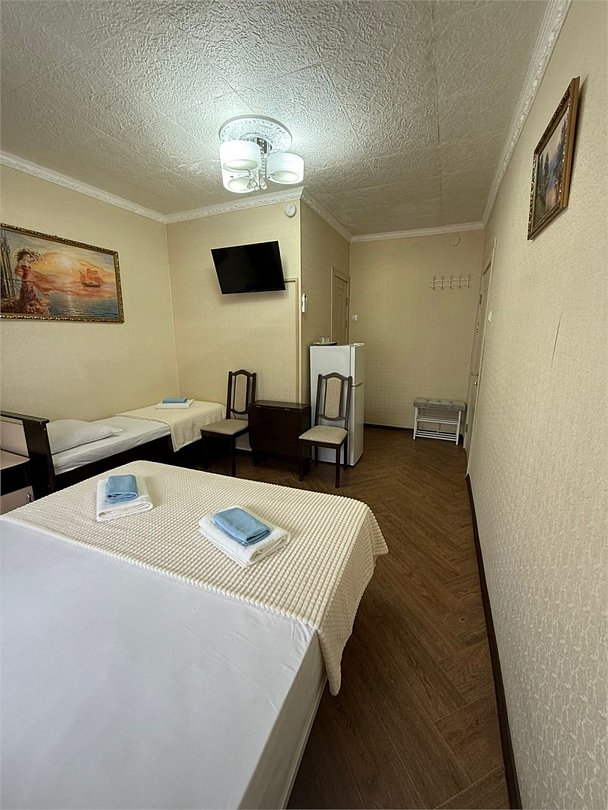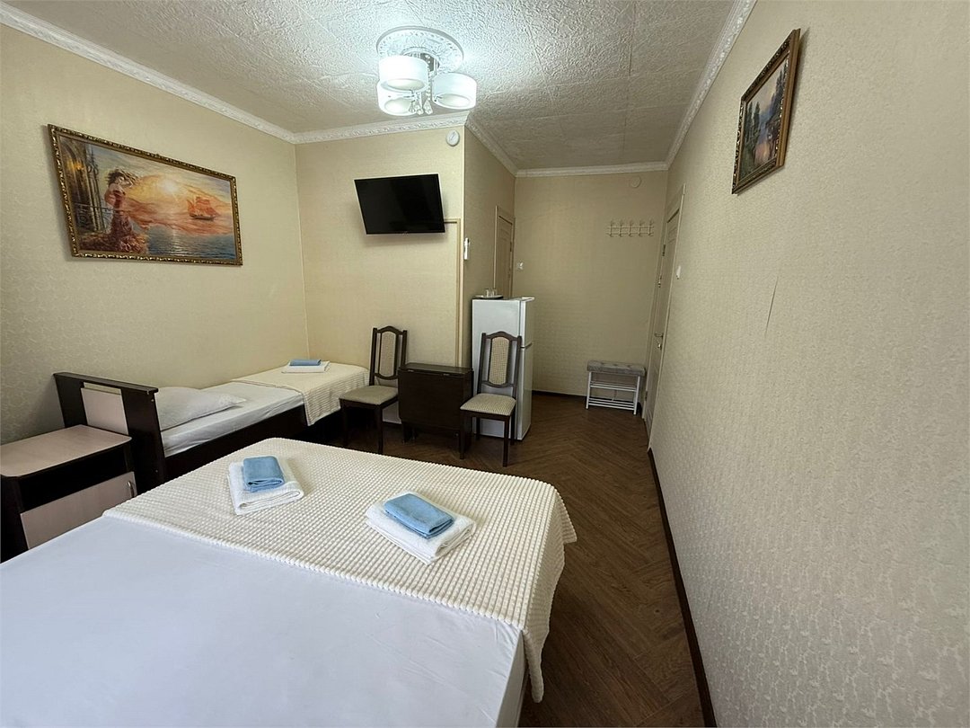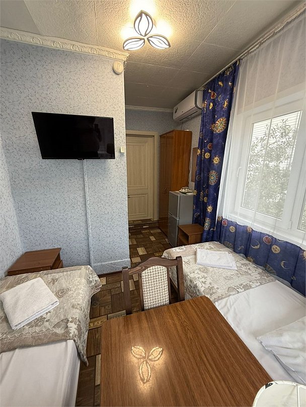 В каждой комнате свой: туалет, ванна, плоский тв, холодильник, кондиционер сплит система, WI-FI интернет, сейф в номере, две односпальные + двуспальная кровать, стол, стулья, зеркало, белье, полотенце, мыло, фен, 20 цифровых каналов, уборка номера по требованию.Услуги и удобства