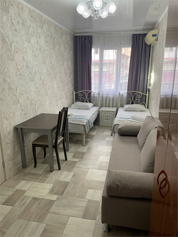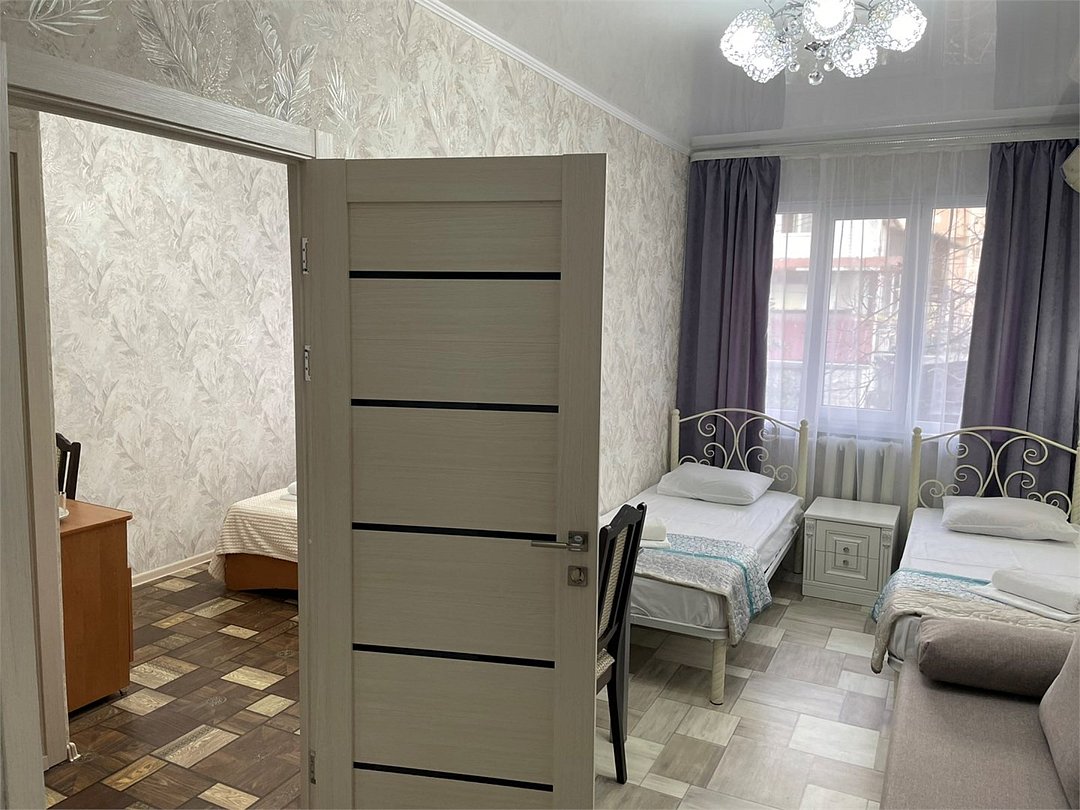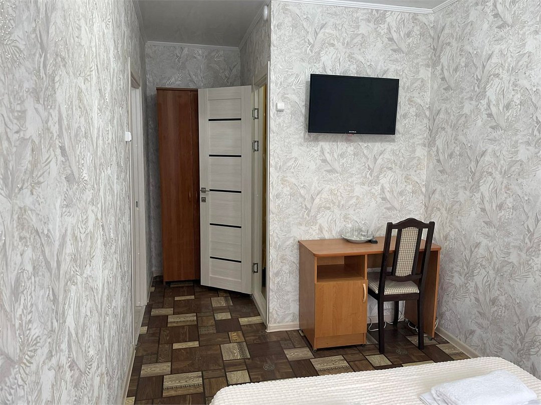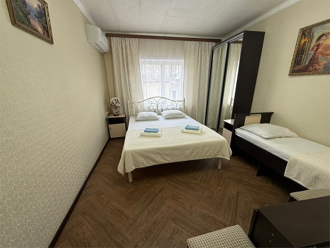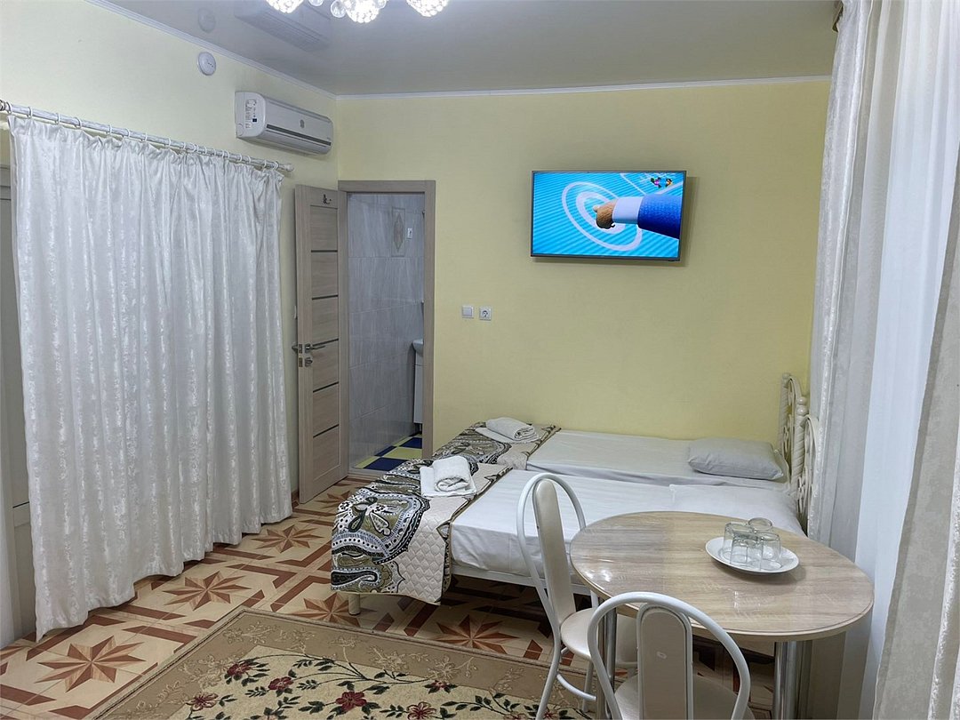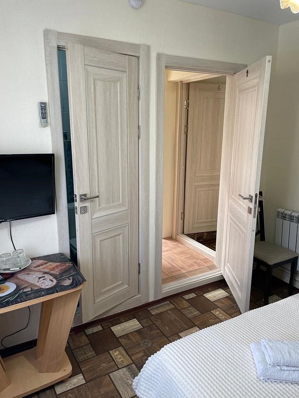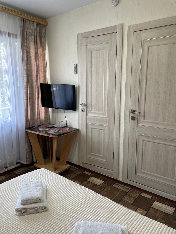 В каждой комнате свой: туалет, ванна, плоский тв, холодильник, кондиционер сплит система, WI-FI интернет, сейф в номере, две односпальные + двуспальная кровать, стол, стулья, зеркало, белье, полотенце, мыло, фен, 20 цифровых каналов, уборка номера по требованию.Услуги и удобства