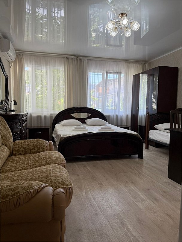 два телевизора, Wi-Fi, холодильник, кондиционер, светильник, фен, система безопасности, утюг, ванная комната, санузел, банные полотенца, двуспальная кровать, две односпальные кровати, гладильная доска, диван, стулья, шкаф для одежды, вешалки, обеденный стол, зеркало, пуфики, две комнаты, сейф, унитаз, раковина, мягкая мебель, гостиная зона, душ, плиточное покрытие, две спальни, вид во двор, кухонная посуда, стаканы, стул, стол, тумба, туалетные средства, туалет, сплит-система, сушилка для белья, цифровое тв, диван-кровать, раскладной диван, телевизор с плоским экраном, москитная сетка, шкаф-купе, номер для некурящих, пуфик, уборка номера, вешалки-плечики, мыло, можно с питомцамиВ гостиничном номере