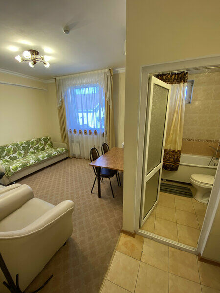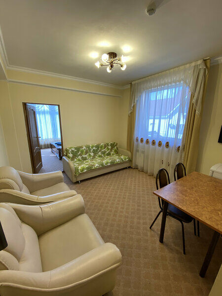 Двухкомнатные номера (спальня и гостиная). В гостиной — кресла и диван, туалетный столик, журнальный столик, телевизор, холодильник, сплит-система. В спальне — просторная двуспальная кровать, прикроватные тумбы, платяной шкаф, телевизор. В ванной комнате — санузел, раковина, ванна.