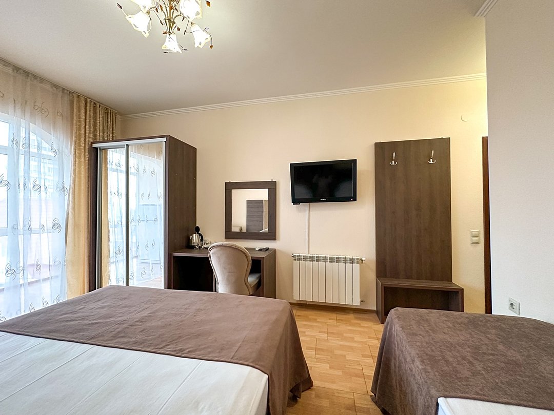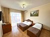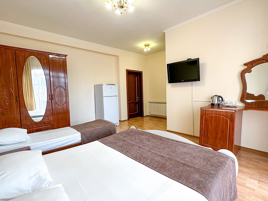 2-спальная кровать, 1-спальная кровать, прикроватные тумбочки, стол, стул, шкаф, зеркало, с/у, душ, ТВ.