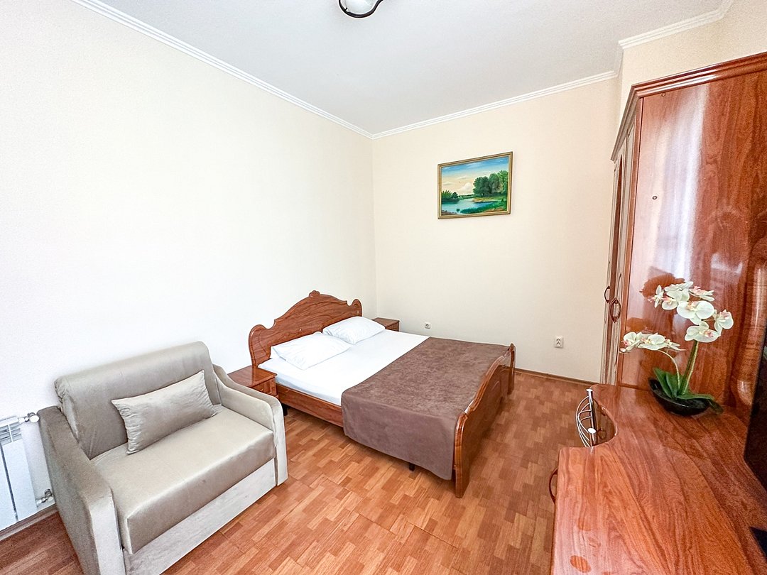 2-спальная кровать, кресло-кровать как основное место, прикроватные тумбочки, стол, стул,шкаф, зеркало, с/у, душ, ТВ.